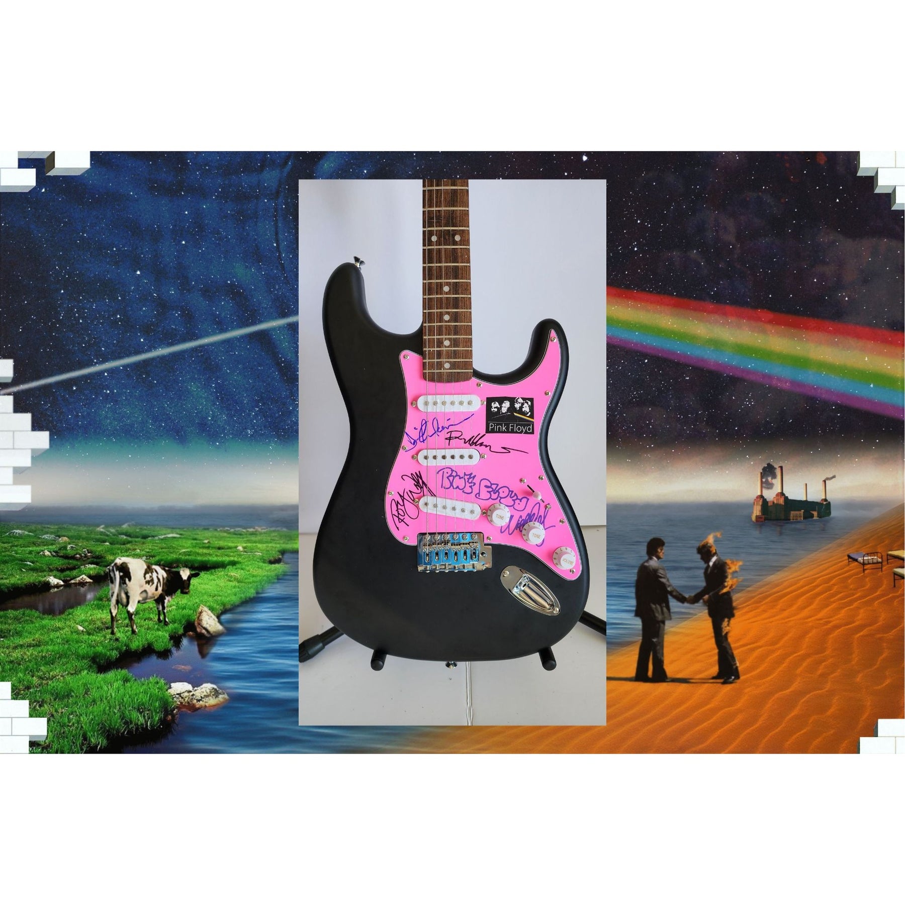 David Gilmour, Roger Waters Richard Wright Nick Mason, Pink Floyd, authentic Fender Stratocaster electric guitar signed with proof