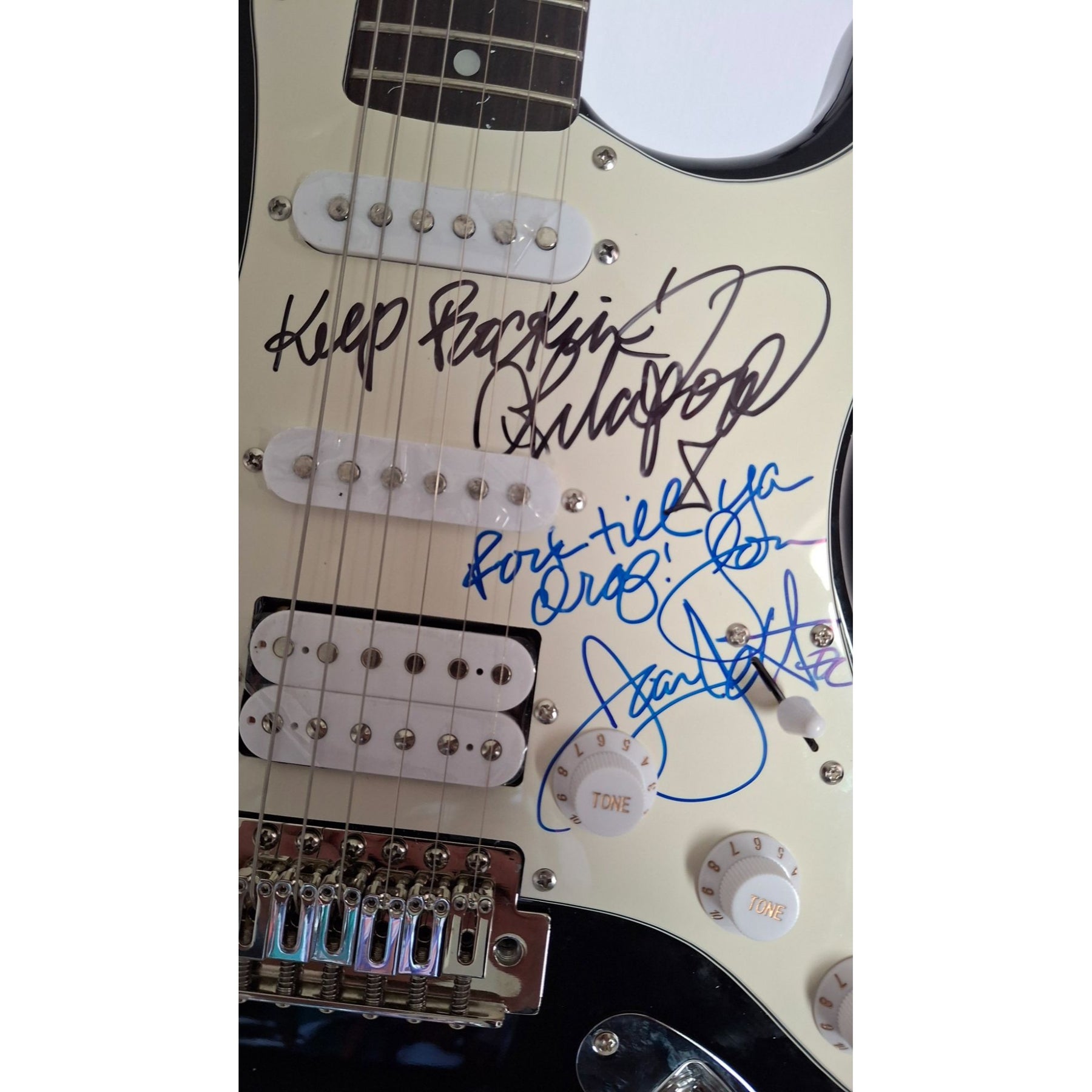 I am including a few cherished framed guitars here from collection and also a couple of my framed guitar pickguards. Originally 40 years ago it was a thrill to get artists to sign guitars however, change is always around the corner and the internet era fell upon us , Princess Diana's death was blamed on Paparazzi chasing her the autograph world also was evolving and in order to be more efficient and get more signatures without problems issues and what I mean by that is being able to attend events be in hotel lobbies and even not offend particular artists who felt as though signing guitars was taboo THE PICKGUARD small and simple but yet large enough to get multiple signatures on became an excellent alternative to getting guitars always signed. You can only carry or keep with you a few guitars where the part of the guitar pickguard which goes on the guitar you can keep 100s of those in a backpack!!
