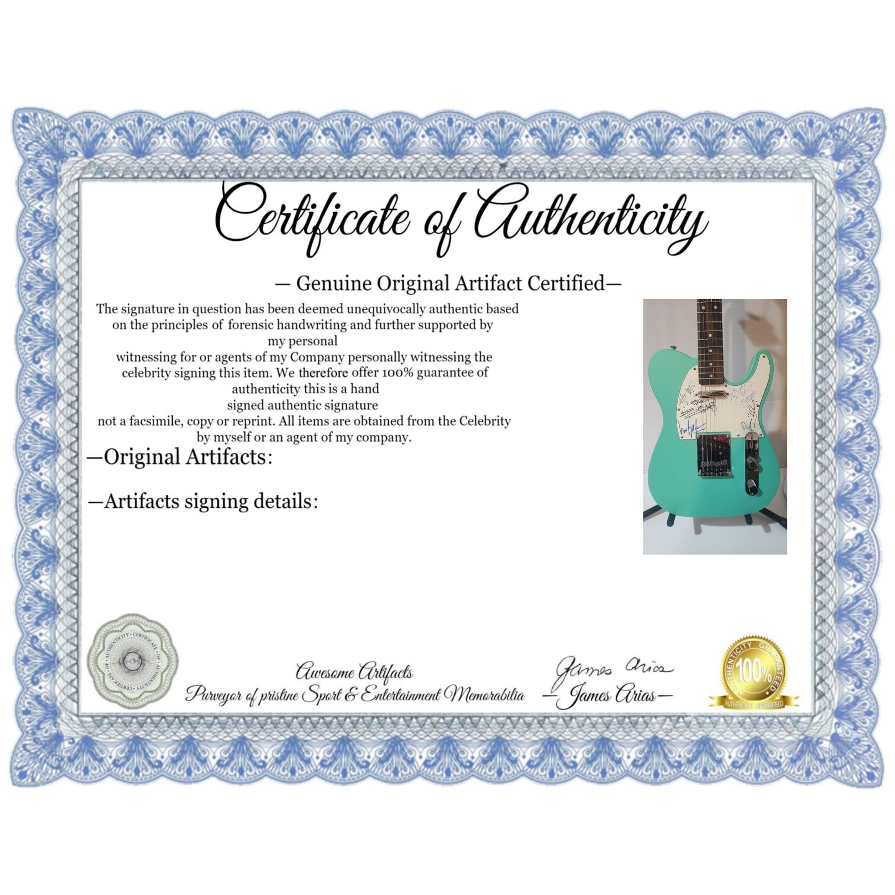 #2 you will receive a certificate of authenticity which will explain the date and location of where I obtained the signatures. Many companies offer an opinion of authenticity I am able to offer 100% guarantee of authenticity as I witness the item being signed personally and I support this claim with signing photos as well as the exact information of where the item was obtained I must say if you take a logical perspective you're getting much more from me than you would get from the so-called authentication companies that give nothing more than an opinion based on no scientific criteria whatsoever by the way