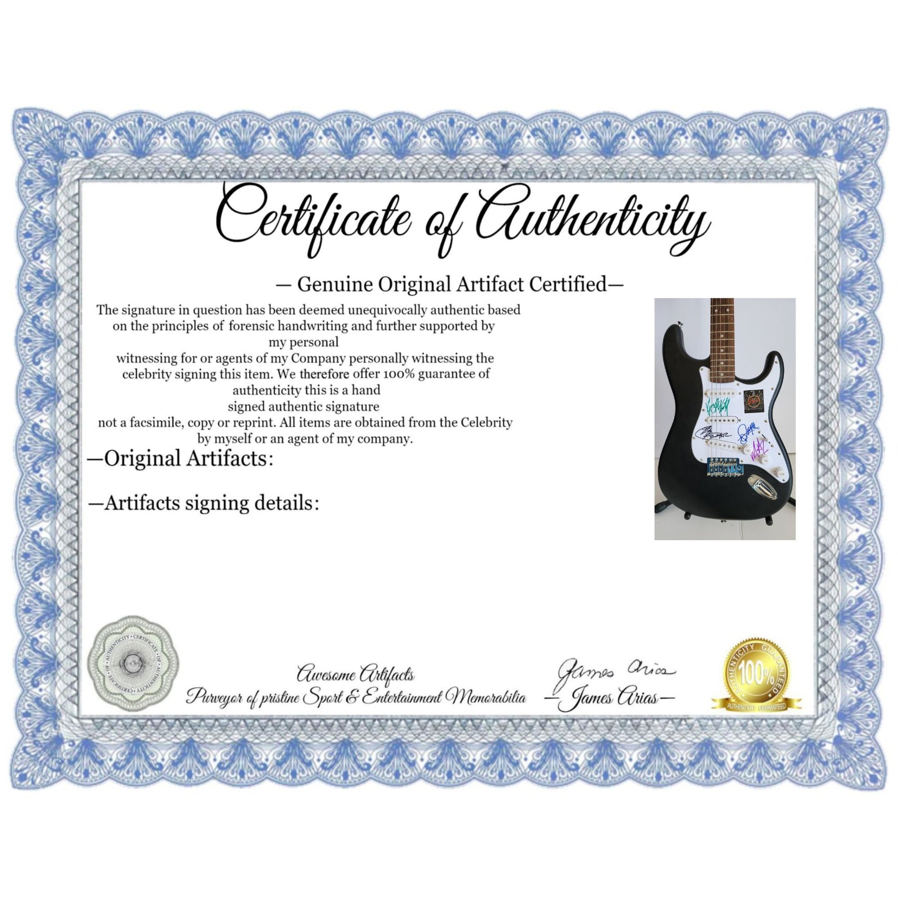 I am including a few cherished framed guitars here from collection and also a couple of my framed guitar pickguards. Originally 40 years ago it was a thrill to get artists to sign guitars however, change is always around the corner and the internet era fell upon us , Princess Diana's death was blamed on Paparazzi chasing her the autograph world also was evolving and in order to be more efficient and get more signatures without problems issues and what I mean by that is being able to attend events be in hotel lobbies and even not offend particular artists who felt as though signing guitars was taboo THE PICKGUARD small and simple but yet large enough to get multiple signatures on became an excellent alternative to getting guitars always signed. You can only carry or keep with you a few guitars where the part of the guitar pickguard which goes on the guitar you can keep 100s of those in a backpack!!