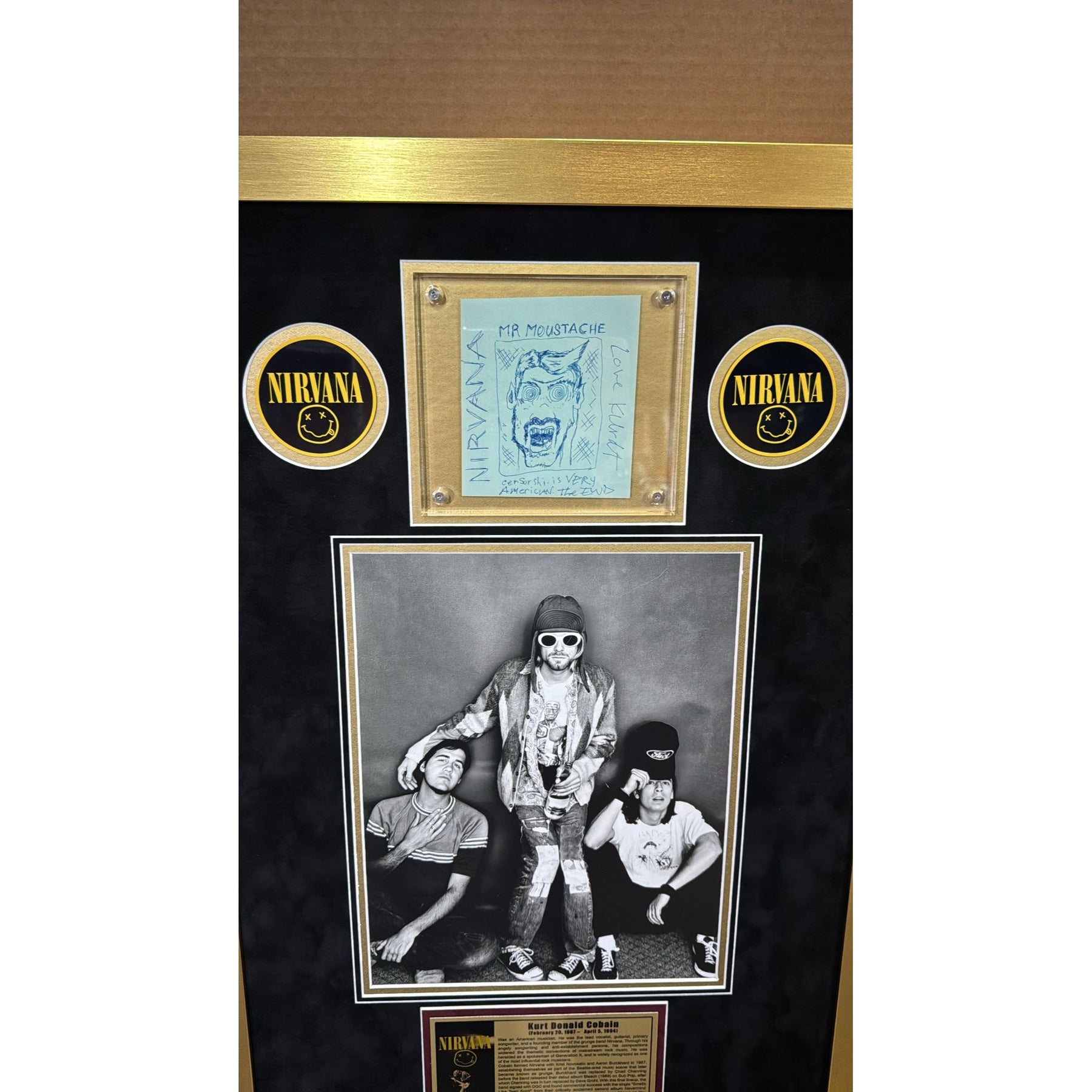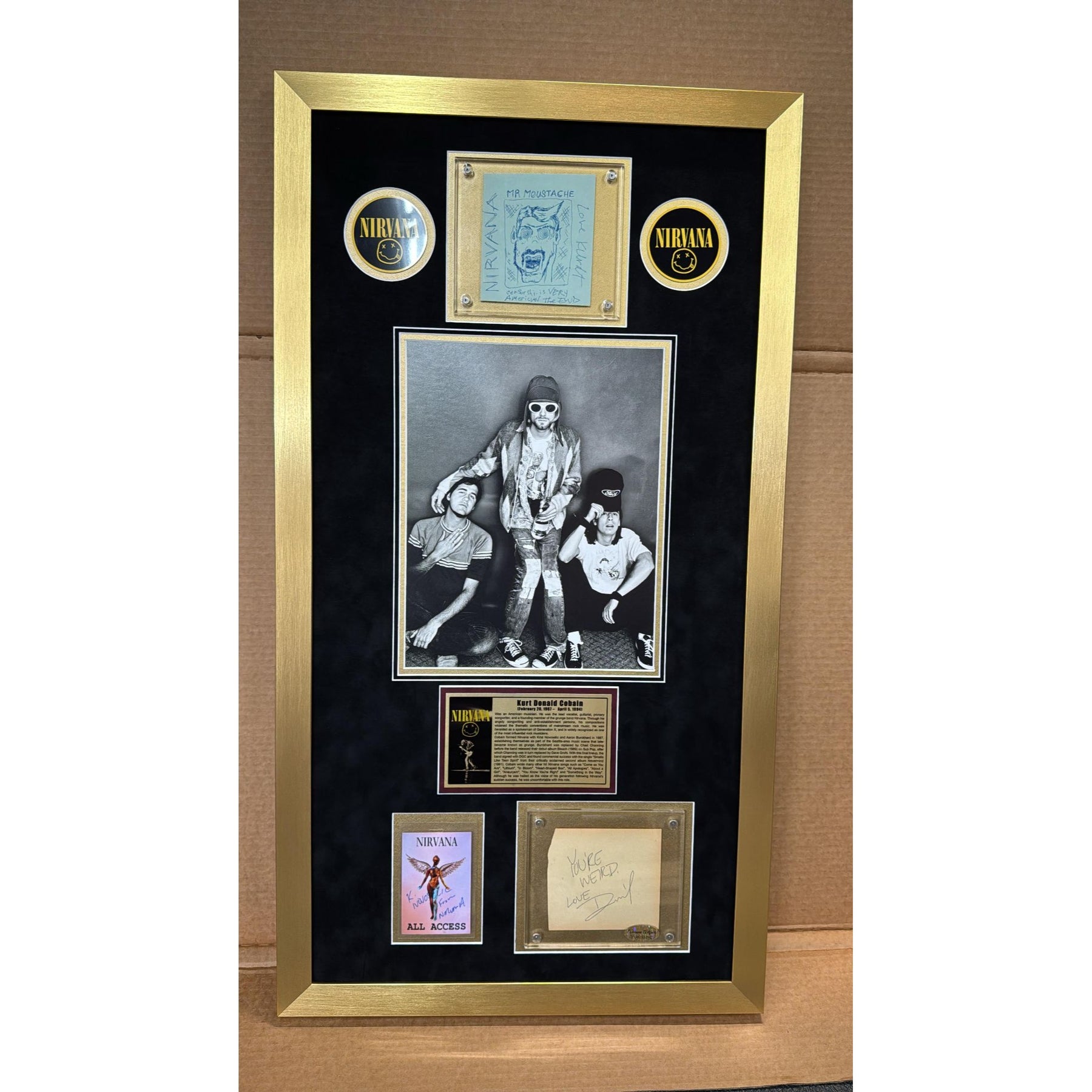 Kurt Cobain David Grohl Krist Novoselic Nirvana signed wirh proof , sketches & museum quality frame 20x36 $7995