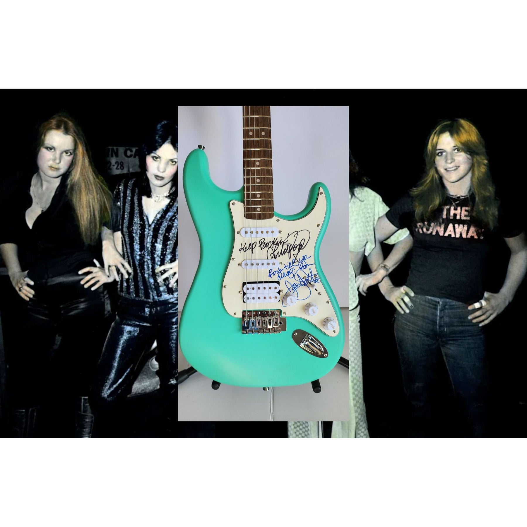 Lita Ford & Joan Jett, signed with inscriptions authentic Fender Stratocaster electric guitar signed with proof