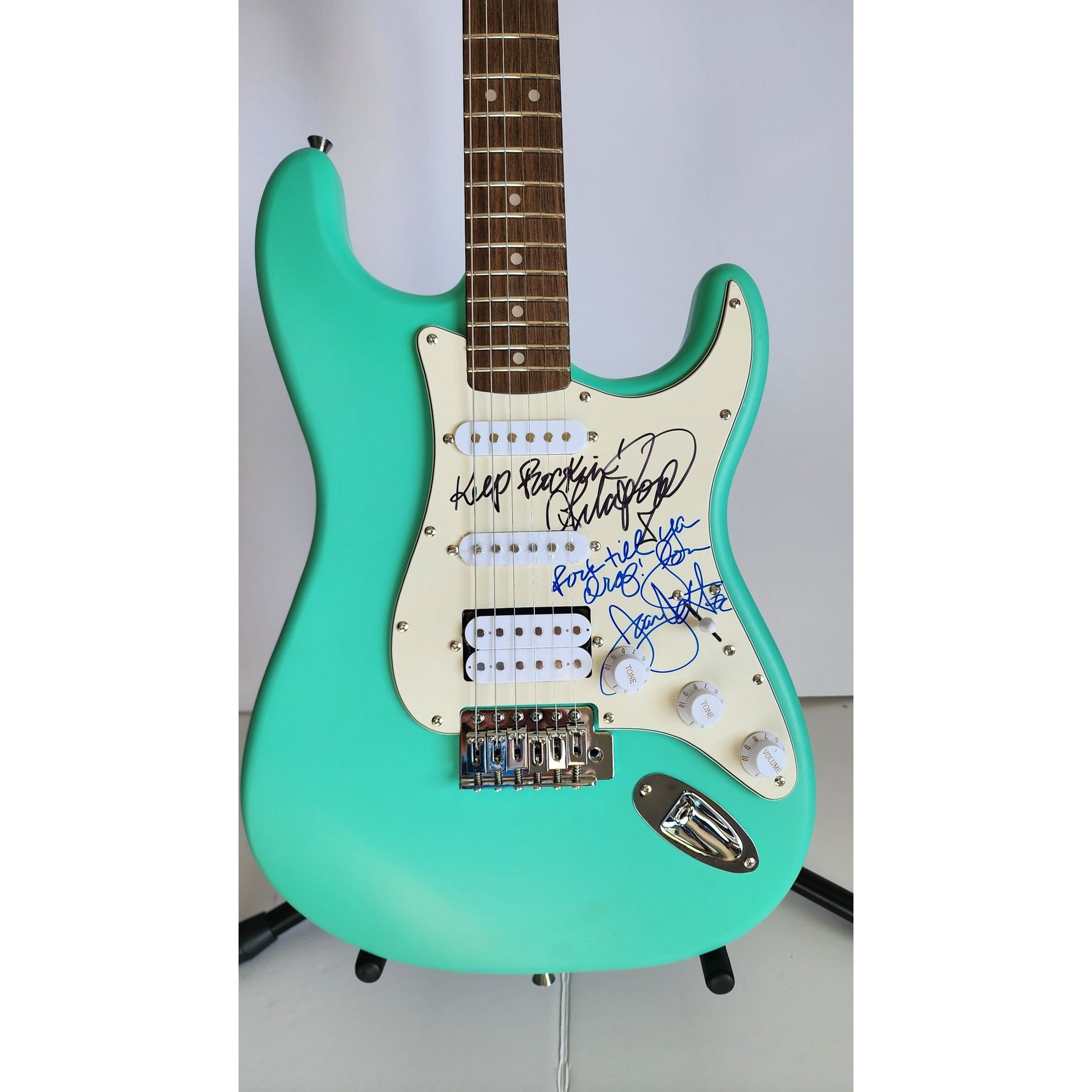 I am including a few cherished framed guitars here from collection and also a couple of my framed guitar pickguards. Originally 40 years ago it was a thrill to get artists to sign guitars however, change is always around the corner and the internet era fell upon us , Princess Diana's death was blamed on Paparazzi chasing her the autograph world also was evolving and in order to be more efficient and get more signatures without problems issues and what I mean by that is being able to attend events be in hotel lobbies and even not offend particular artists who felt as though signing guitars was taboo THE PICKGUARD small and simple but yet large enough to get multiple signatures on became an excellent alternative to getting guitars always signed. You can only carry or keep with you a few guitars where the part of the guitar pickguard which goes on the guitar you can keep 100s of those in a backpack!!