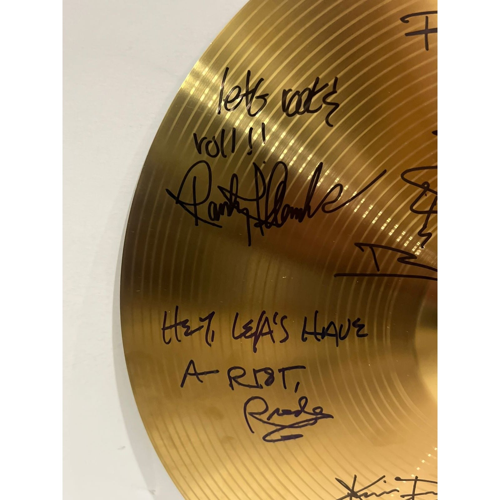 Quiet Riot, signed and inscribed in black ink and felt tip, "—let's rock & roll!! Randy Rhoads," " Hugs from Riot, Drew," " Hey, let's have a riot, Rudy," and " Keep havin' a riot! Kevin DuBrow.”