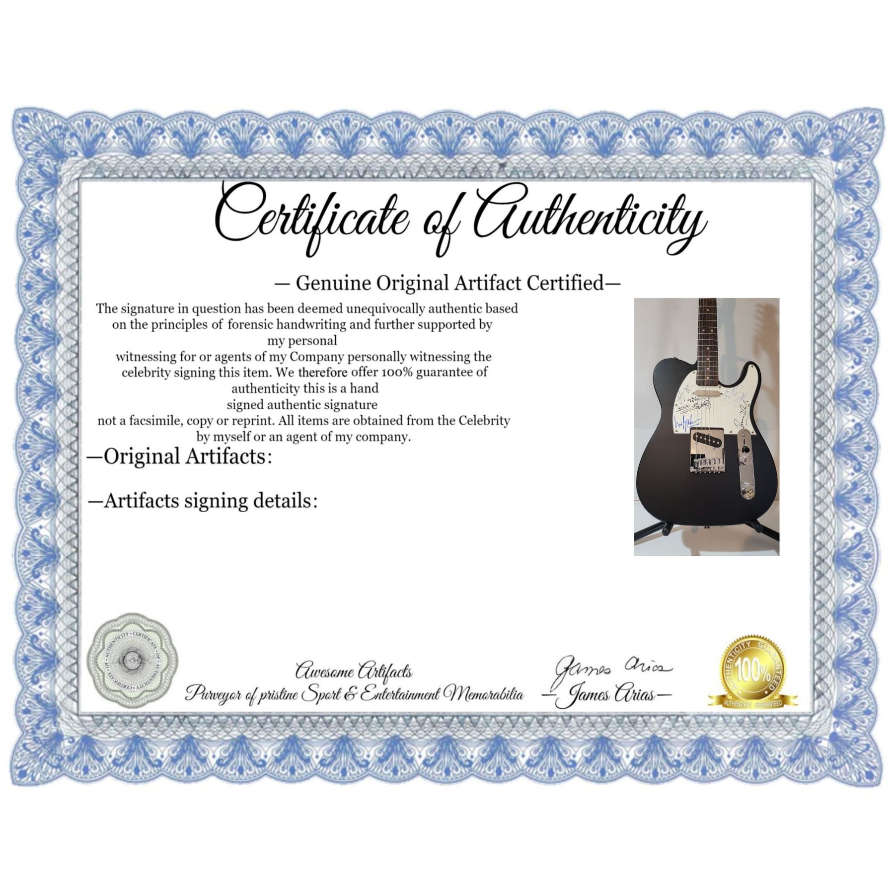 #2 you will receive a certificate of authenticity which will explain the date and location of where I obtained the signatures. Many companies offer an opinion of authenticity I am able to offer 100% guarantee of authenticity as I witness the item being signed personally and I support this claim with signing photos as well as the exact information of where the item was obtained I must say if you take a logical perspective you're getting much more from me than you would get from the so-called authentication companies that give nothing more than an opinion based on no scientific criteria whatsoever by the way