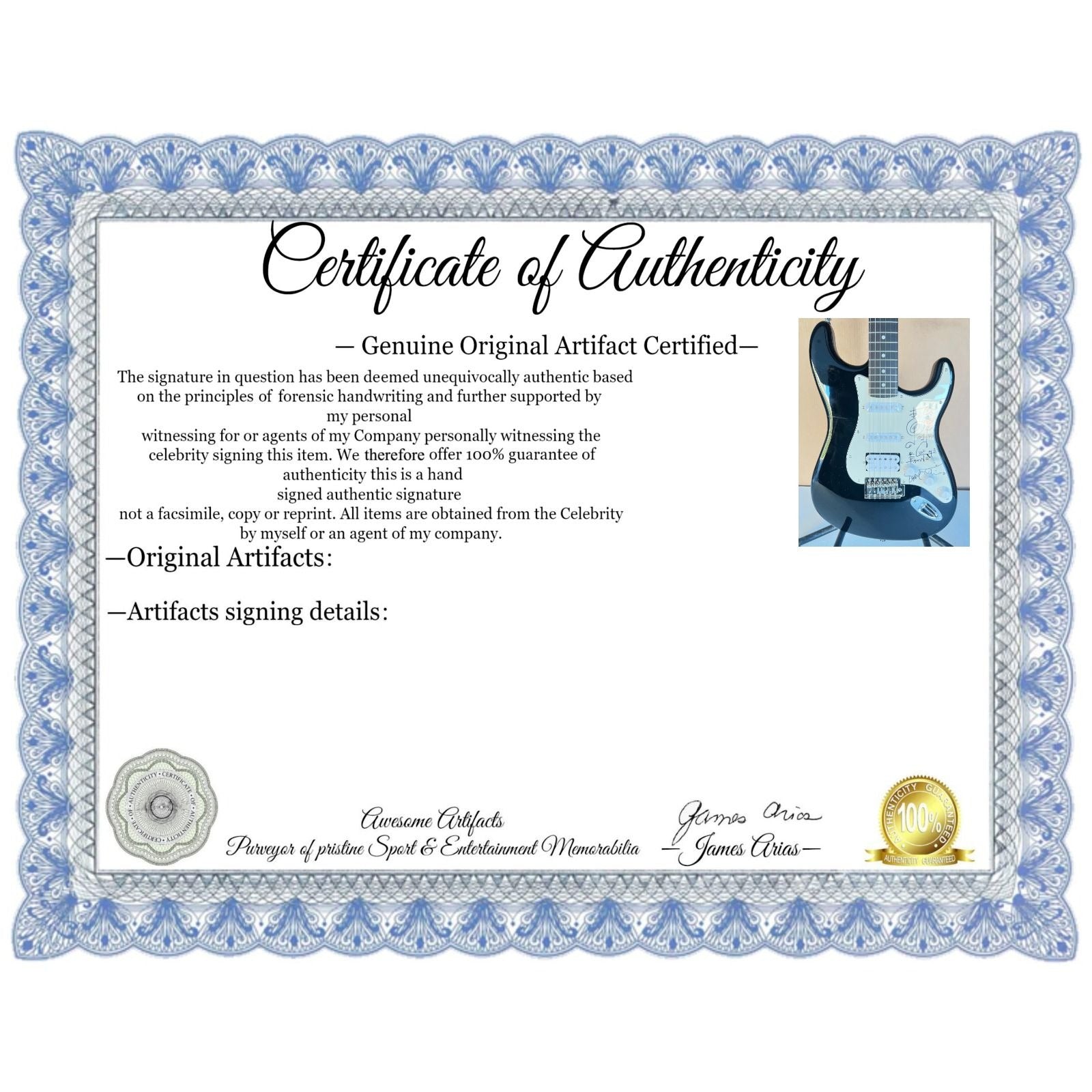 #2 you will receive a certificate of authenticity which will explain the date and location of where I obtained the signatures. Many companies offer an opinion of authenticity I am able to offer 100% guarantee of authenticity as I witness the item being signed personally and I support this claim with signing photos as well as the exact information of where the item was obtained I must say if you take a logical perspective you're getting much more from me than you would get from the so-called authentication companies that give nothing more than an opinion based on no scientific criteria whatsoever by the way