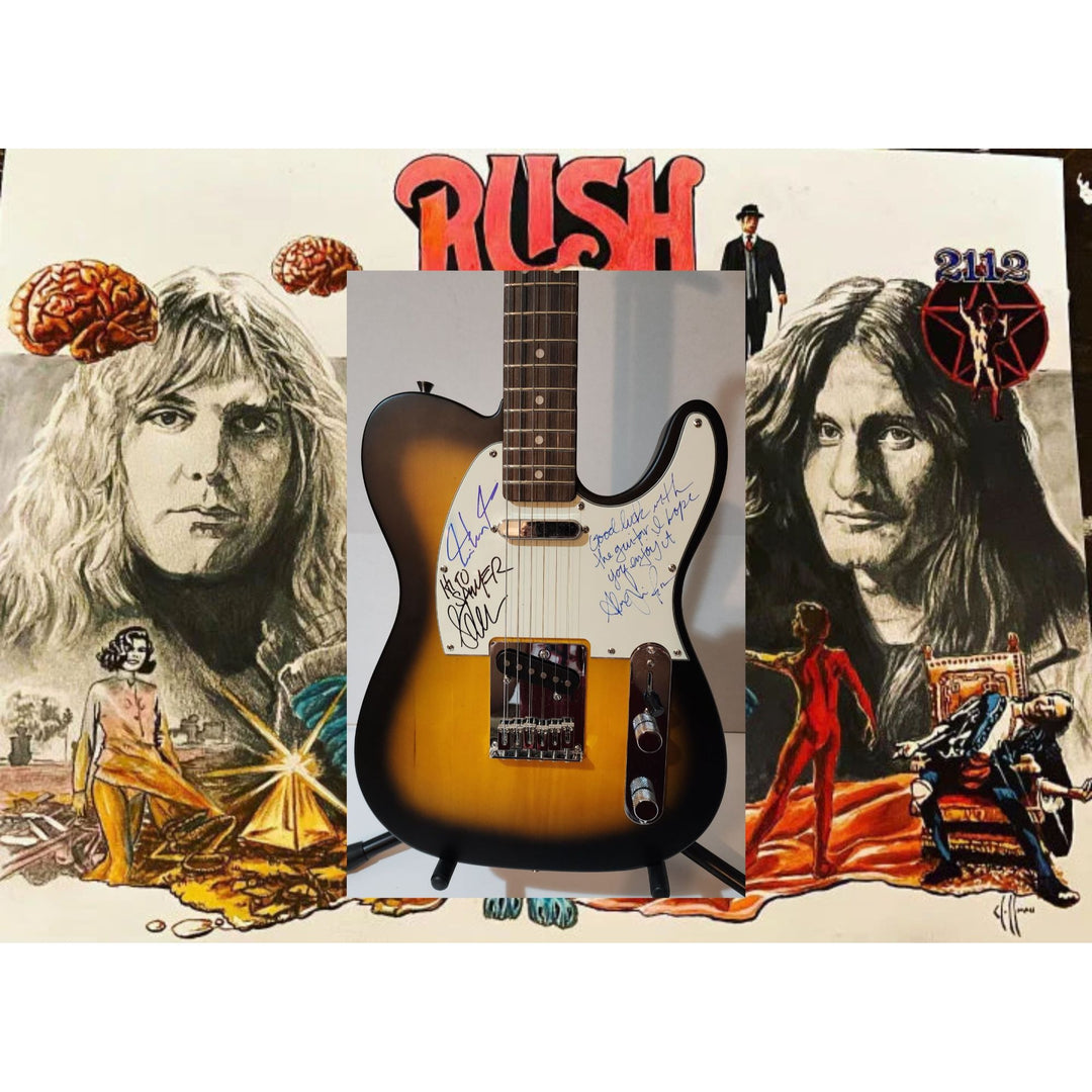 Rush full band Alex, Geddy (inscription), Neil Fender telecaster full size electric guitar signed with proof