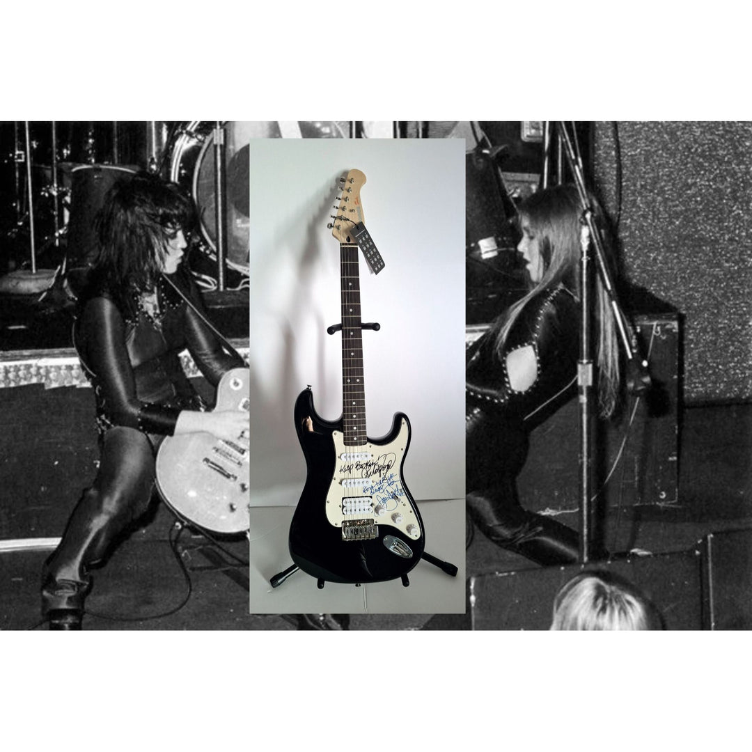 Lita Ford & Joan Jett, signed with inscriptions authentic Fender Stratocaster electric guitar signed with proof