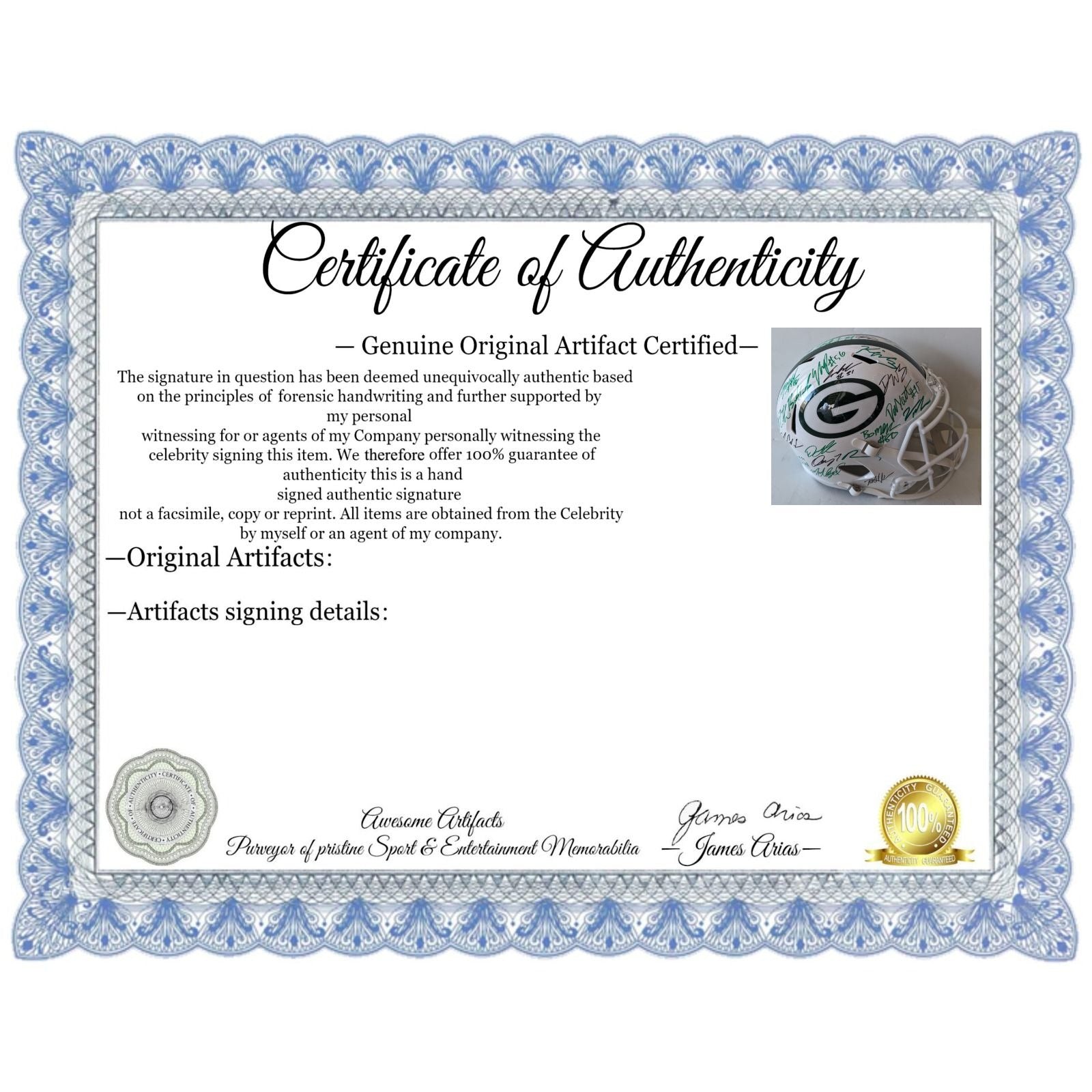 #2 you will receive a certificate of authenticity which will explain the date and location of where I obtained the signatures. Many companies offer an opinion of authenticity I am able to offer 100% guarantee of authenticity as I witness the item being signed personally and I support this claim with signing photos as well as the exact information of where the item was obtained I must say if you take a logical perspective you're getting much more from me than you would get from the so-called authentication companies that give nothing more than an opinion based on no scientific criteria whatsoever by the way