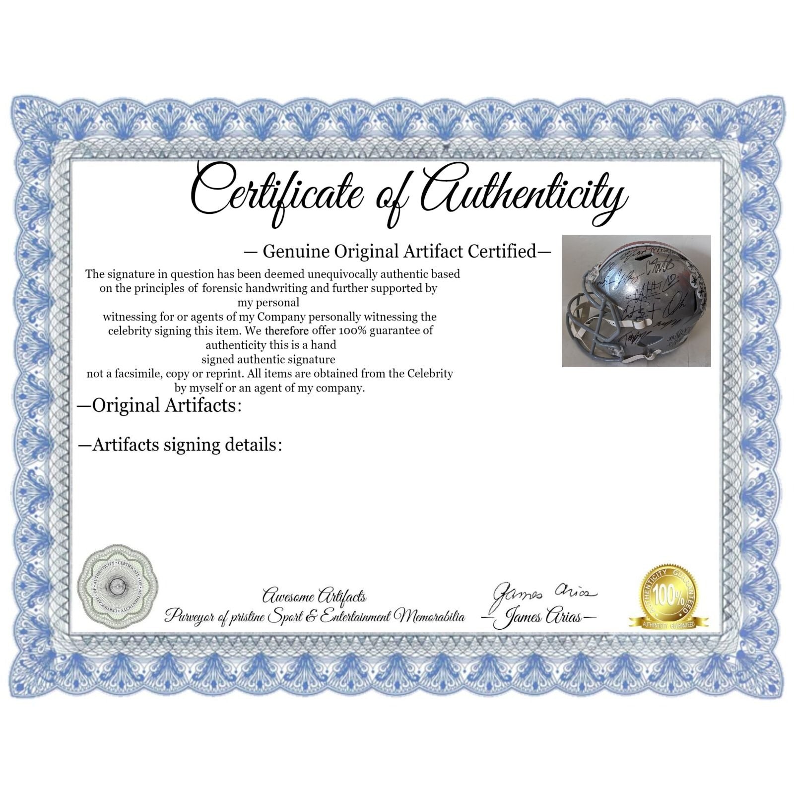 #2 you will receive a certificate of authenticity which will explain the date and location of where I obtained the signatures. Many companies offer an opinion of authenticity I am able to offer 100% guarantee of authenticity as I witness the item being signed personally and I support this claim with signing photos as well as the exact information of where the item was obtained I must say if you take a logical perspective you're getting much more from me than you would get from the so-called authentication companies that give nothing more than an opinion based on no scientific criteria whatsoever by the way