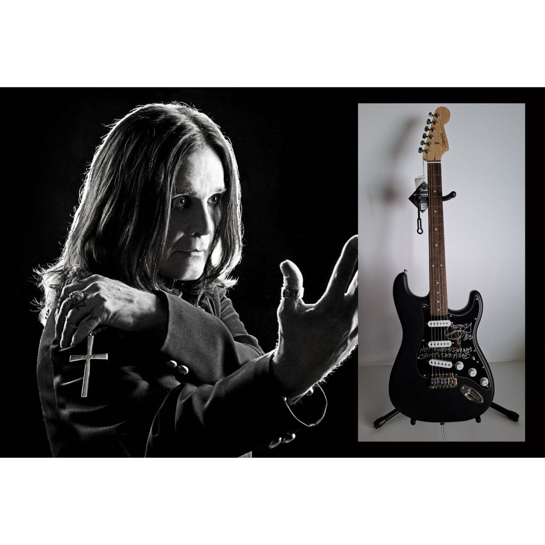 Ozzy Osbourne, Black Sabbath signed with inscription for Ronnie James Dio, Fender Stratocaster electric guitar signed with proof
