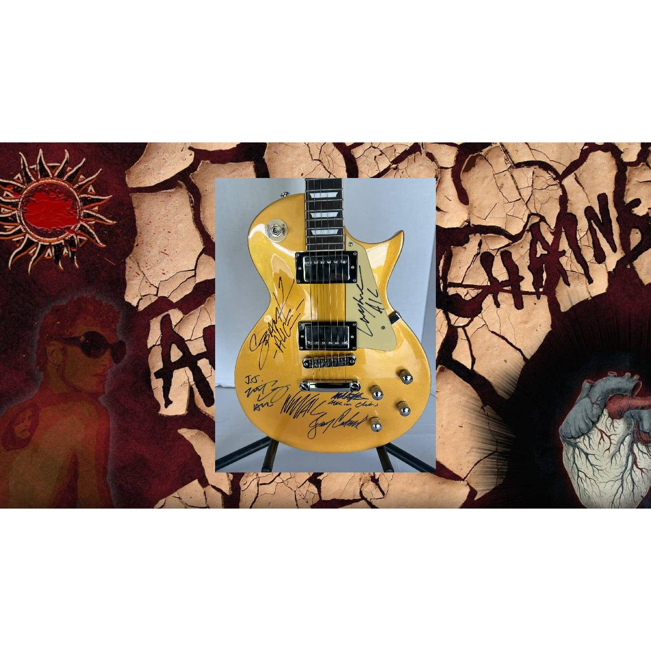 Alice N' Chains Mike Starr, Layne Staley, Jerry Cantrell, Sean Kinney, William Duvall, gold les paul electric guitar signed with proof $6,995
