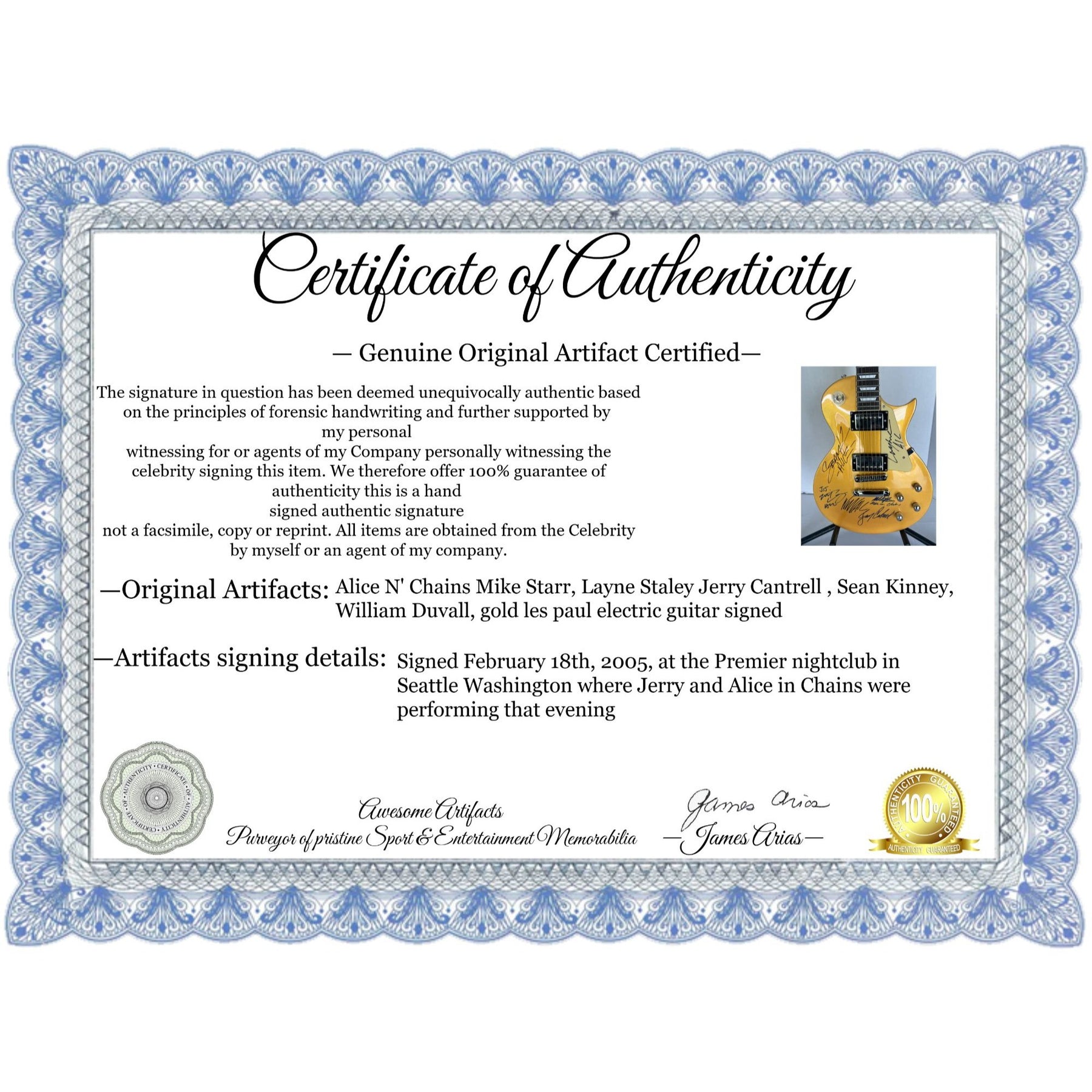 Signed February 18th, 2005, at the Premier nightclub in Seattle Washington where Jerry and Alice in Chains were performing that evening