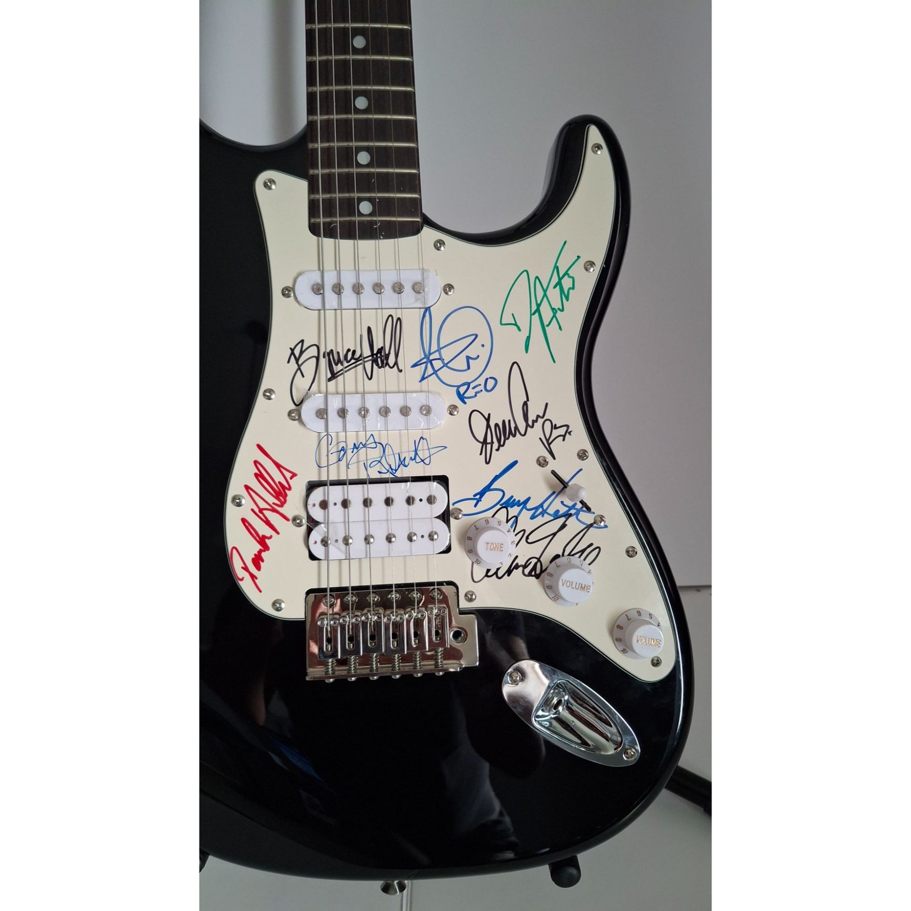 Bruce Hall, Dave Matto, Gary Richrath, Kevin Cronin, Neal Dought, REO Speedwagon Fender Stratocaster Squier electric guitar signed with proof $3995