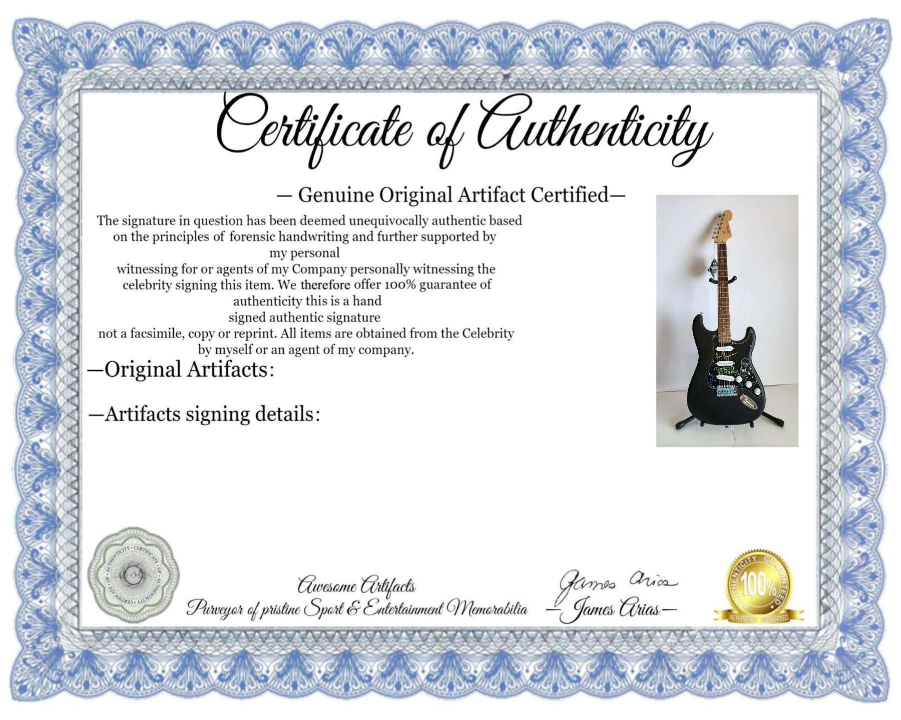 #2 you will receive a certificate of authenticity which will explain the date and location of where I obtained the signatures. Many companies offer an opinion of authenticity I am able to offer 100% guarantee of authenticity as I witness the item being signed personally and I support this claim with signing photos as well as the exact information of where the item was obtained I must say if you take a logical perspective you're getting much more from me than you would get from the so-called authentication companies that give nothing more than an opinion based on no scientific criteria whatsoever by the way