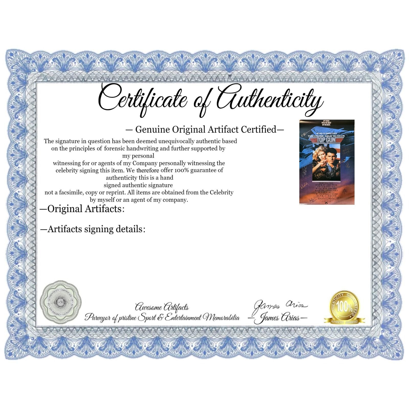 Signers include Tom Cruise, Tim Robins, Kelly McGillis, Val Kilmer, Anthony Edwards, Tom Skerritt, Whip Hubley, James Tolkan, Meg Ryan, Kenny Loggins, Terri Nunn