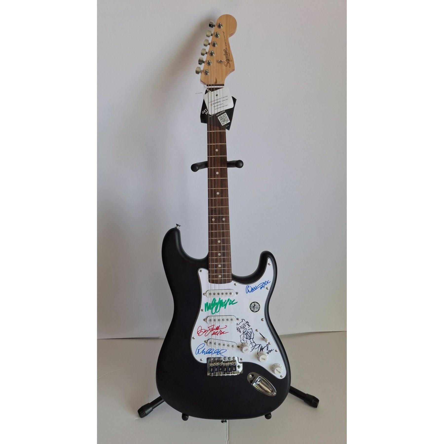 I am including a few cherished framed guitars here from collection and also a couple of my framed guitar pickguards. Originally 40 years ago it was a thrill to get artists to sign guitars however, change is always around the corner and the internet era fell upon us , Princess Diana's death was blamed on Paparazzi chasing her the autograph world also was evolving and in order to be more efficient and get more signatures without problems issues and what I mean by that is being able to attend events be in hotel lobbies and even not offend particular artists who felt as though signing guitars was taboo THE PICKGUARD small and simple but yet large enough to get multiple signatures on became an excellent alternative to getting guitars always signed. You can only carry or keep with you a few guitars where the part of the guitar pickguard which goes on the guitar you can keep 100s of those in a backpack!!