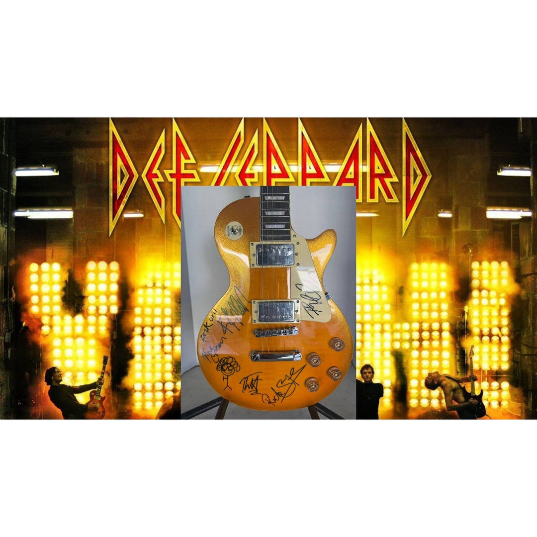Def Leppard Phil Collen, Vivian Campbell, Joe Elliott, Rick Savage, Rick Allen. Gold Les Paul electric guitar signed with proof.