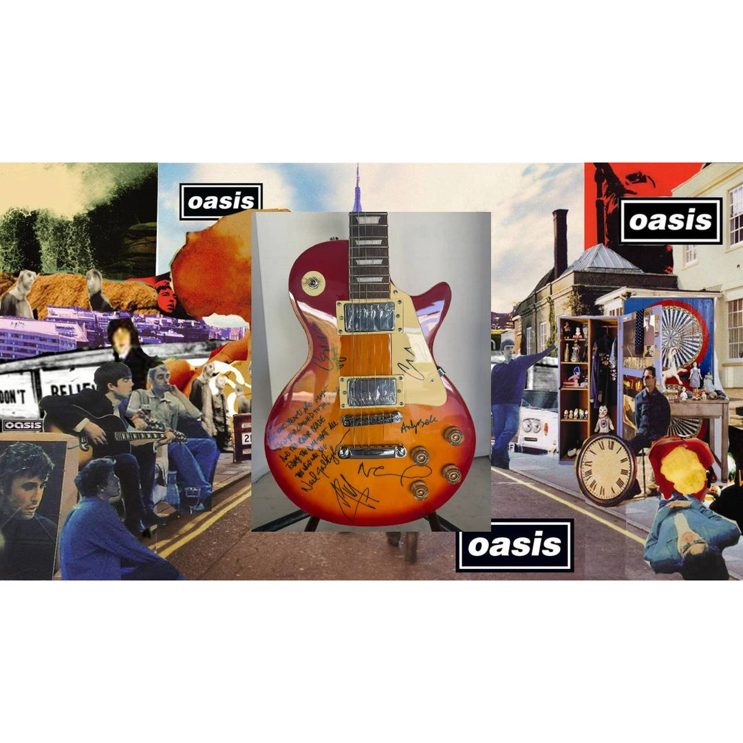 Oasis Alan White, Andy Bell, Gem Archer, Liam Gallagher, Noal Gallagher (included lyrics) Cherry les paul electric guitar Signed with proof.