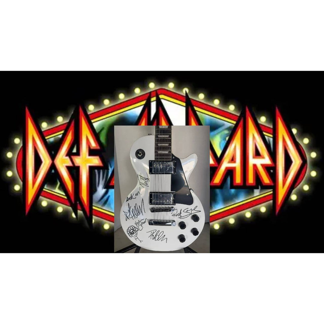Def Leppard Phil Collen, Vivian Campbell, Joe Elliott, Rick Savage, Rick Allen. White Les Paul electric guitar signed with proof.