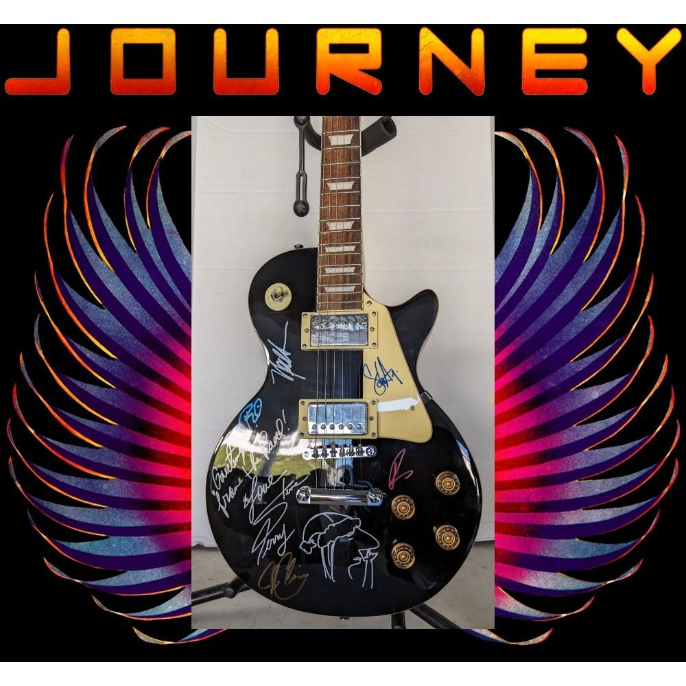 Journey Steve Perry, Jonathan Cain, Ross Valory, Steve Augeri, Deen Castronovo, Neal Schon les paul electric guitar signed with proof