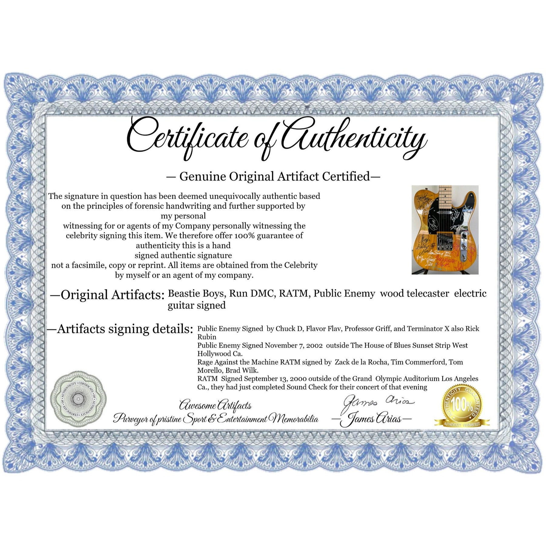 Beastie Boys, Run DMC, RATM, Public Enemy  wood telecaster  electric guitar signed with proof $5,995