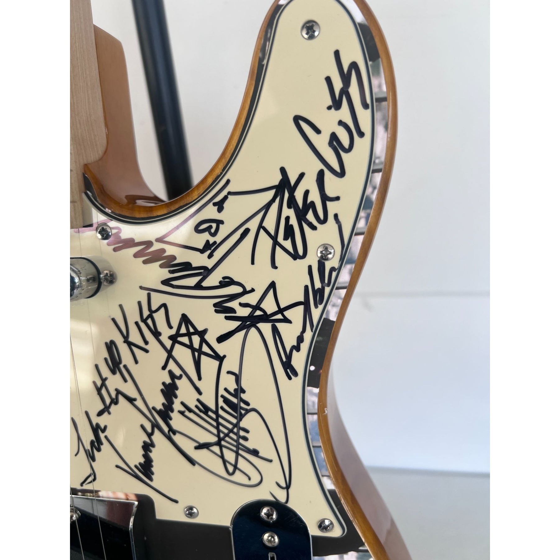 When I first started getting autographs in the world of entertainment and music I would always try and keep a couple guitars in my car , because day to day here in the Los Angeles / Hollywood area you just never could imagine who you might run into. My point being we may have been at Los Angeles International Airport waiting on Lennox Lewis to arrive on Virgin Atlantic from London and we would end up seeing U2 coming through the terminal. I eventually came to the conclusion I would always have a lot of pickguards on hand which I could have in my backpack eliminating the situation of not having anything for music figures to sign when I end up coming across them.