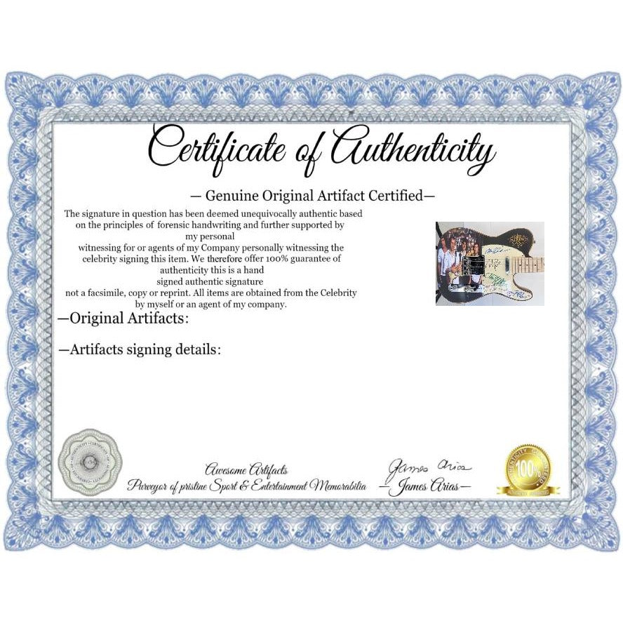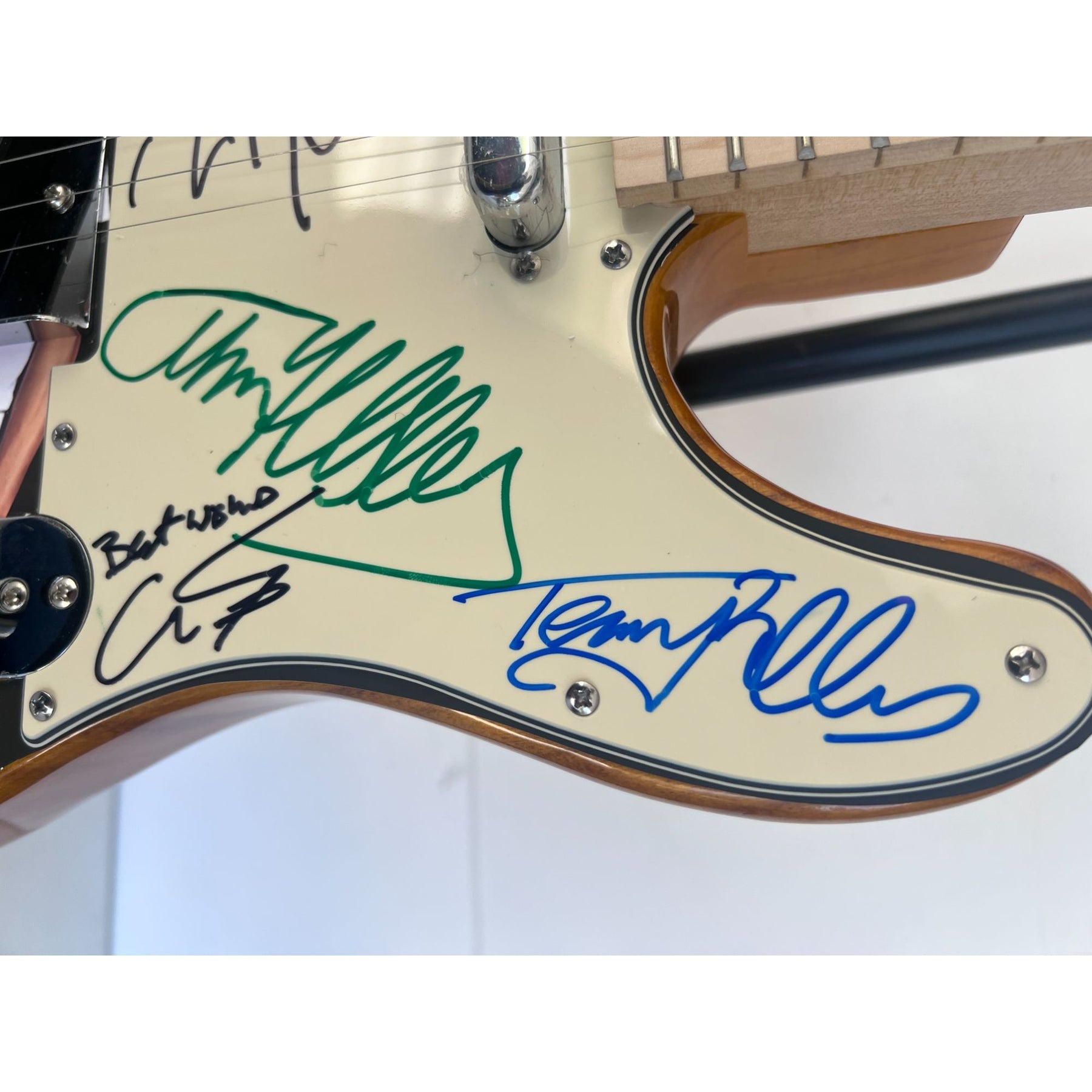 When I first started getting autographs in the world of entertainment and music I would always try and keep a couple guitars in my car , because day to day here in the Los Angeles / Hollywood area you just never could imagine who you might run into. My point being we may have been at Los Angeles International Airport waiting on Lennox Lewis to arrive on Virgin Atlantic from London and we would end up seeing U2 coming through the terminal. I eventually came to the conclusion I would always have a lot of pickguards on hand which I could have in my backpack eliminating the situation of not having anything for music figures to sign when I end up coming across them.