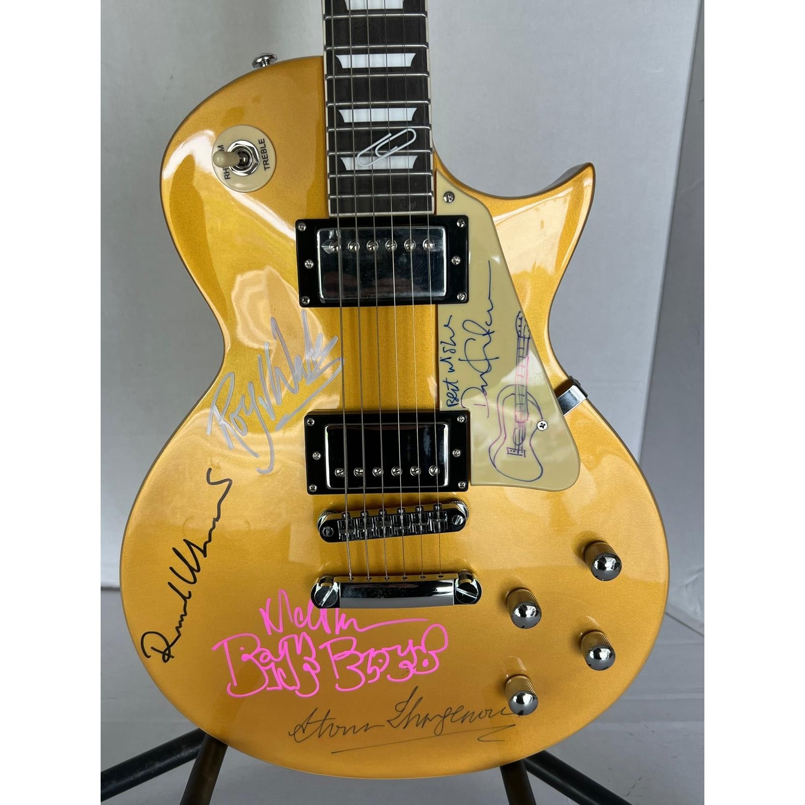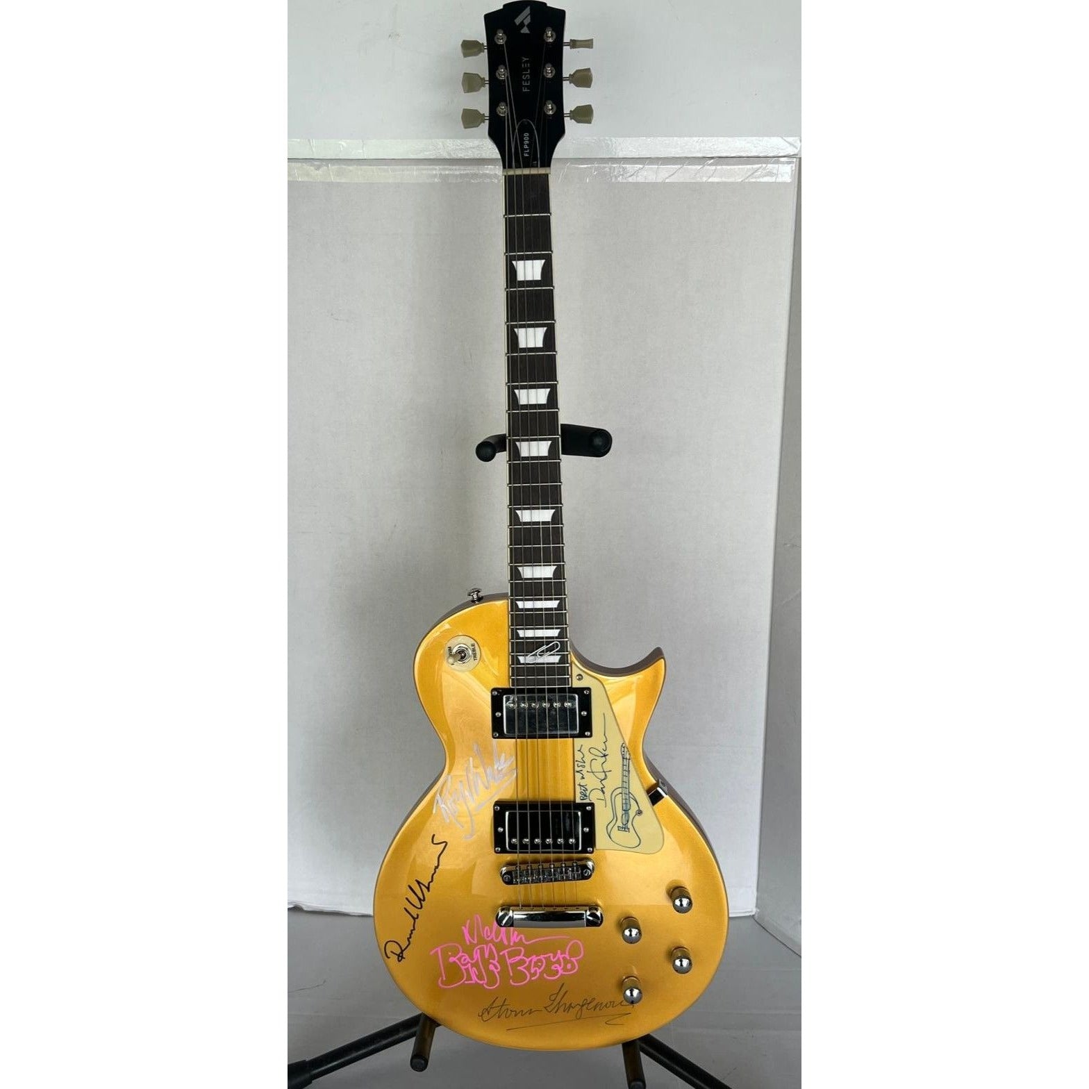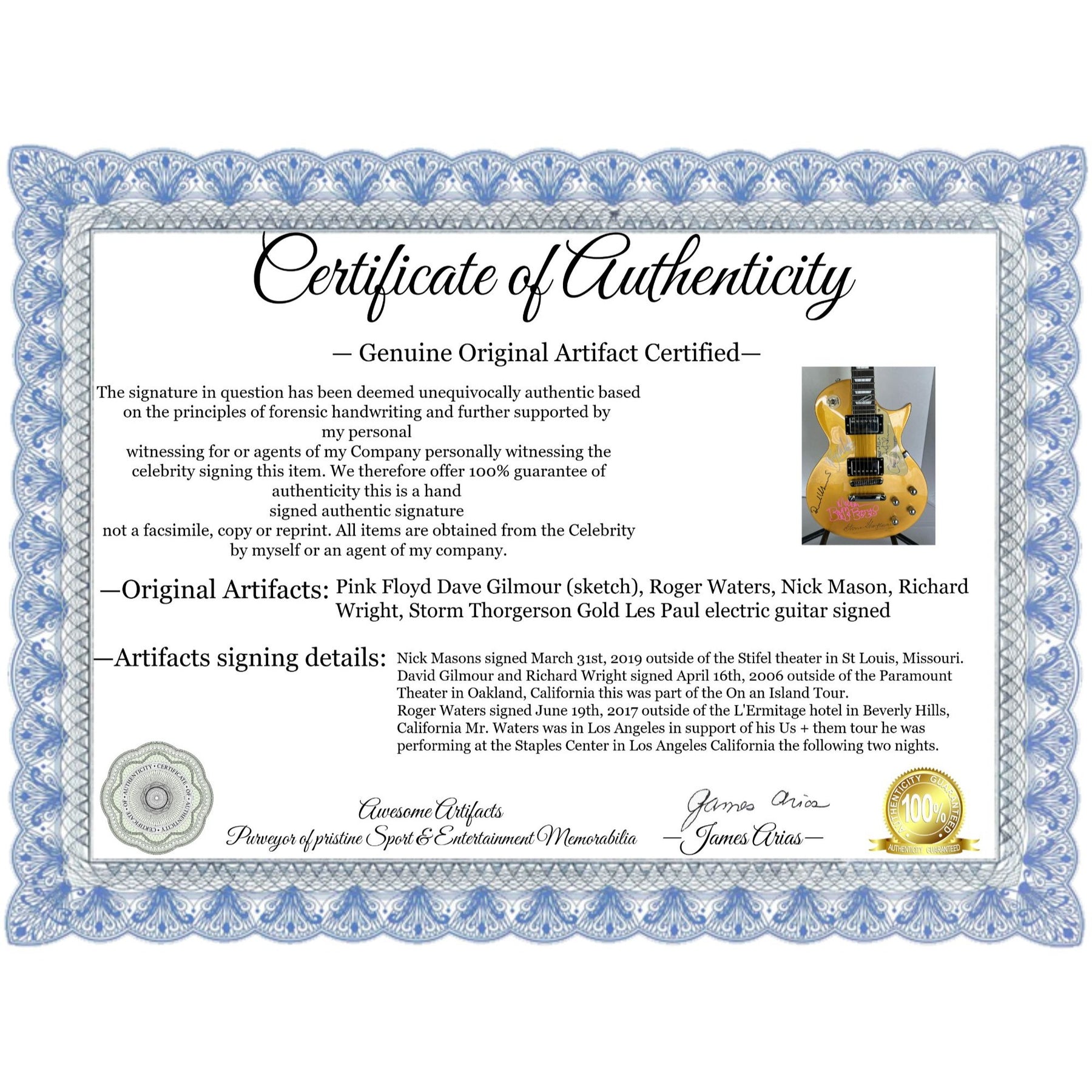 Pink Floyd David Gilmour (sketch), Roger Waters, Nick Mason, Richard Wright, Storm Thorgerson Gold Les Paul electric guitar signed with proof $7,999