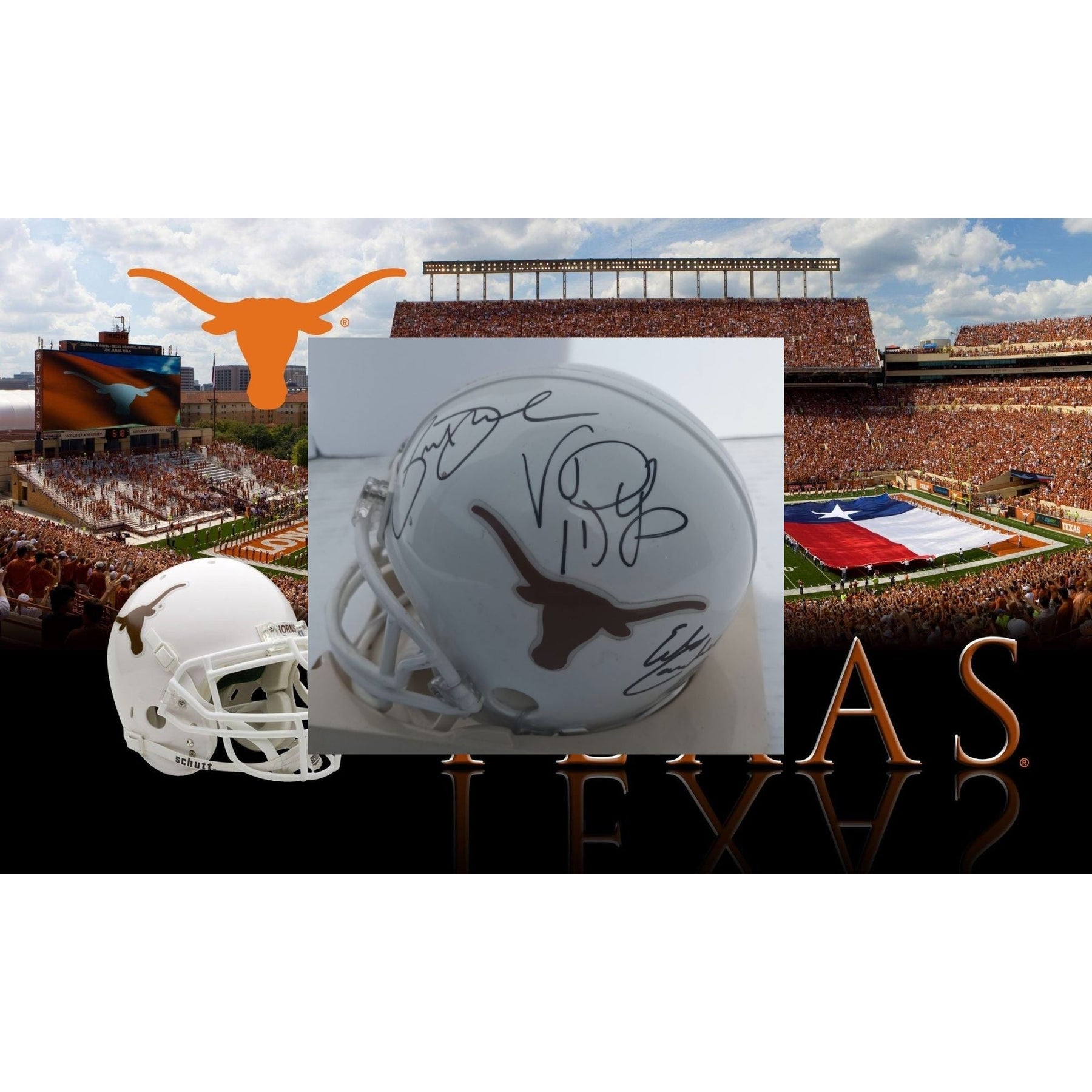 Texas Longhorns Priest Holmes Vince Young Earl Campbell Riddell mini helmet signed with proof