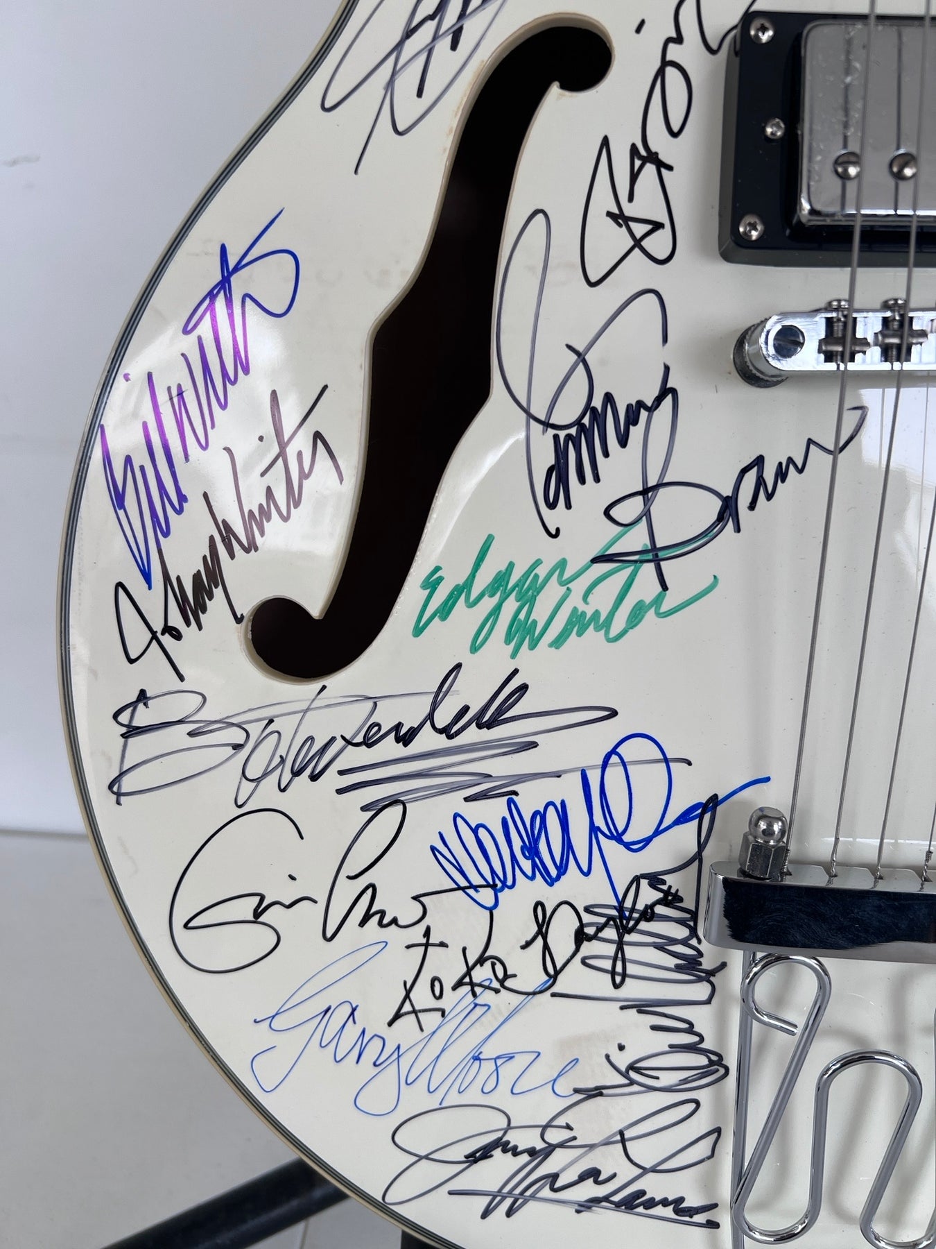 Blues an R&B legends 28 signed in all Stevie Ray Vaughan Bill Withers Stevie Wonder Eric Clapton Hollow body electric guitar signed with proof