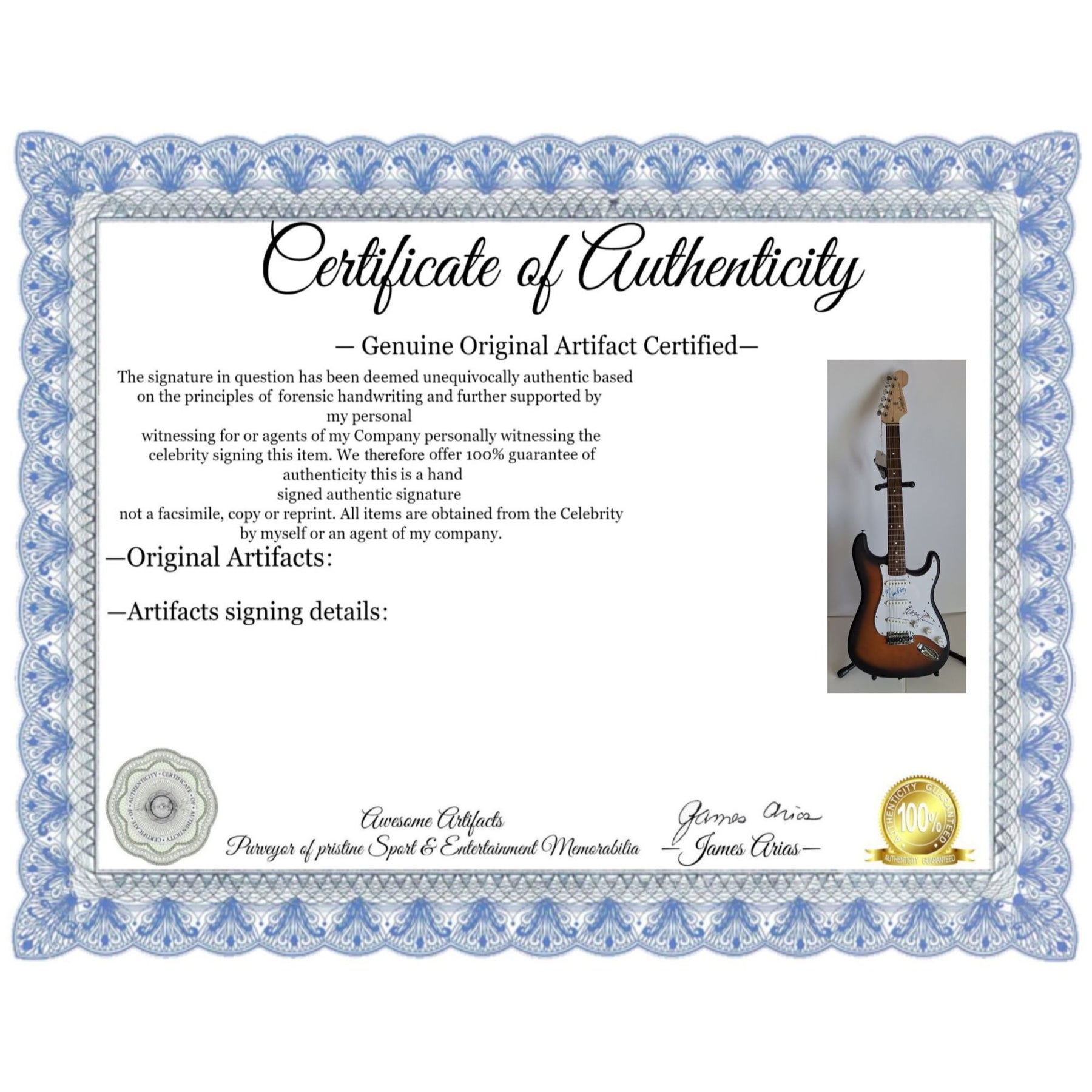 #2 you will receive a certificate of authenticity which will explain the date and location of where I obtained the signatures. Many companies offer an opinion of authenticity I am able to offer 100% guarantee of authenticity as I witness the item being signed personally and I support this claim with signing photos as well as the exact information of where the item was obtained I must say if you take a logical perspective you're getting much more from me than you would get from the so-called authentication companies that give nothing more than an opinion based on no scientific criteria whatsoever by the way