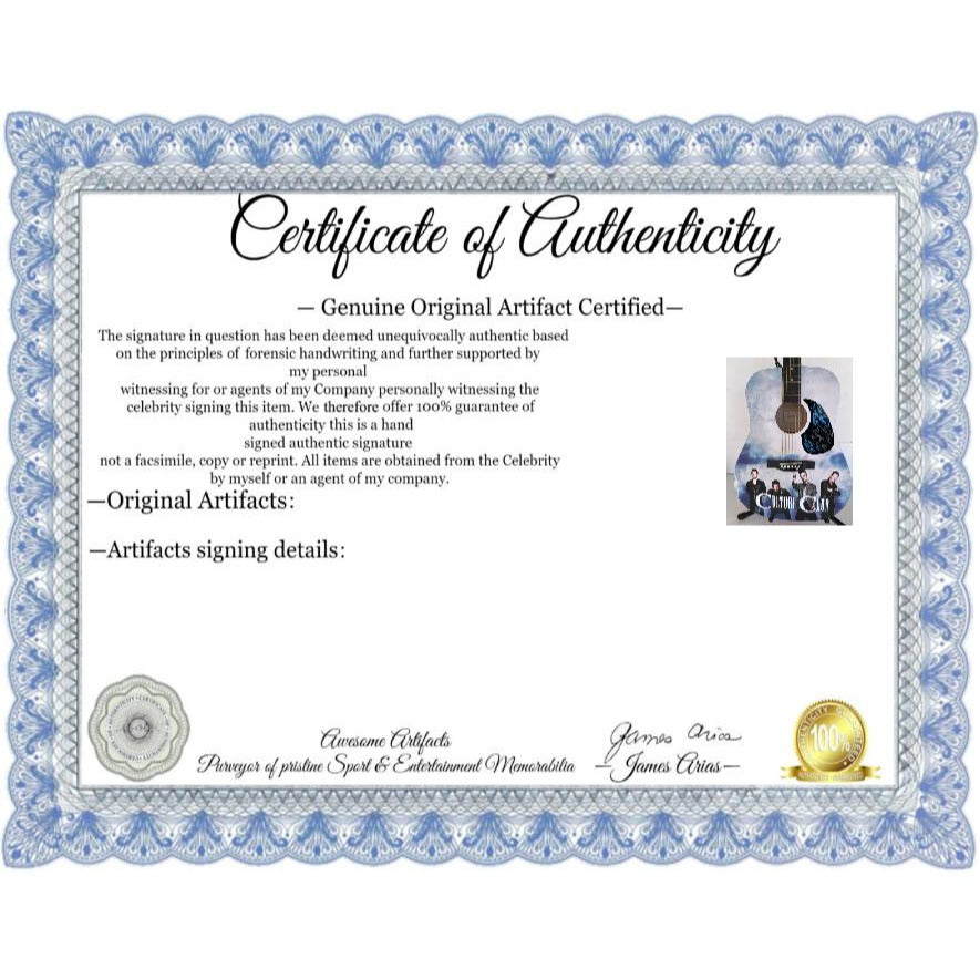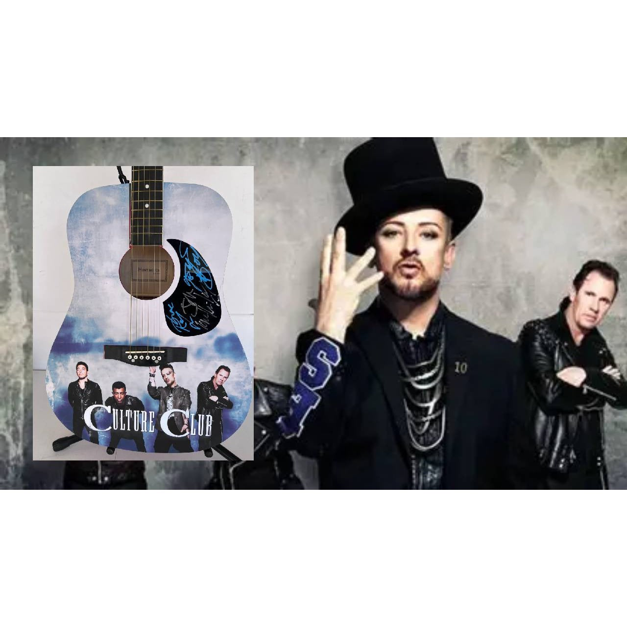 Culture Club George O'Dowd Boy George full size acoustic guitar (one of a kind ) signed with proof $2,995 signed by Boy George,  Jon Moss, Roy Hay, Mikey Craig Signed Julio 2nd, 2016 at Las Rosas Hotel in Ensenada, prior to his band performance that evening at Baja Mar Country Club in Ensenada, Mexico. When I first started getting autographs in the world of entertainment and music I would always try and keep a couple guitars in my car , because day to day here in the Los Angeles / Hollywood area you just never could imagine who you might run into. My point being we may have been at Los Angeles International Airport waiting on Lennox Lewis to arrive on Virgin Atlantic from London and we would end up seeing U2 coming through the terminal. I eventually came to the conclusion I would always have a lot of pickguards on hand which I could have in my backpack eliminating the situation of not having anything for music figures to sign when I end up coming across them. Now with modern technology I have been able to take my pickguards and assemble them with the beautiful guitars which you see here . Make no mistake, these guitars are 100% authentic & unique so there is no chance of finding them elsewhere. If you would like to enhance and preserve this awesome piece , we offer Museum quality framing. If would like to take advantage of this excellent offer it is only an additional $650 including shipping, feel free to email me and I'll adjust the price to include the framing. When you grow up 20 minutes from the entertainment capital of the world Hollywood Ca. where we host the Grammy Awards annually, we have recording studios where all of the music industries elite have been recording their hits for more than 50 years, there are iconic hotels such as the Sunset Marquis and The Chateau Mamount that Rock n Roll artists have been staying at for years, a large amount of the music videos are produced throughout the greater Los Angeles area, then there is the likes of Melrose Ave where you could run into Kurt Cobain or Madonna buying albums at a second hand record store, or Prince doing a free signing at Tower Records, not to mention the fact that so many artists have homes here and I would often run into Bruce Springsteen at the Ivy in Beverly Hills or Jay Z and Beyonce or the Red Hot Chili Peppers at the Staples center (now the Crypto Currency arena). Sometimes bands on tour like the Rolling Stones would spend 7-10 days in Beverly Hills at the Four Seasons, they would make LA there hub and just fly into the different West Coast cities for their concert and then jump on their private jet and be back at the Four Seasons in BH that same evening. Next day would be an off day. **Need to Know Answers & Questions** #1 My number one priority when offering my collection to the public is that you receive an item which you can cherish and be proud to display and are completely 100% satisfied with the purchase. This being said I have a simple policy within 30 days of receiving your item if you are not completely satisfied, we accept the item back without question. You will be responsible for shipping, and you will receive a refund the day the item is received back in our possession. #2 The item what you see is the item which you will receive , as I mentioned earlier these items come from my personal collection and they are truly one of a kind so when they are gone they are gone for good. #3 All items which I sell come with a Certificate of Authenticity and with your certificate I will provide specific details, the date and location of where I obtained the signature(s). The nice thing here is I do not offer an opinion of authenticity rather you receive a guarantee of authenticity which I am able to offer as I have witnessed the items which I am offering actually being signed by the sports figure or celebrity. #4 Shipping is always free. We Ship Worldwide. We ship within 24 to 48 hours of payment being received generally USPS Priority Mail, however upon request we can ship expidiated service for an additional fee. We can also ship FedEx d h l or UPS if need be. I pack all items personally and I take into consideration how I like my packages when I make purchases to be packed and I do the same for my customers. #5 We offer custom Museum quality framing if you are interested in this option feel free to email me it generally takes an additional seven to 10 days to complete the project. #6 We are available 7 days a week via email to answer questions. When at all possible, we get back to our customers and potential customers via email within an hour of their email.