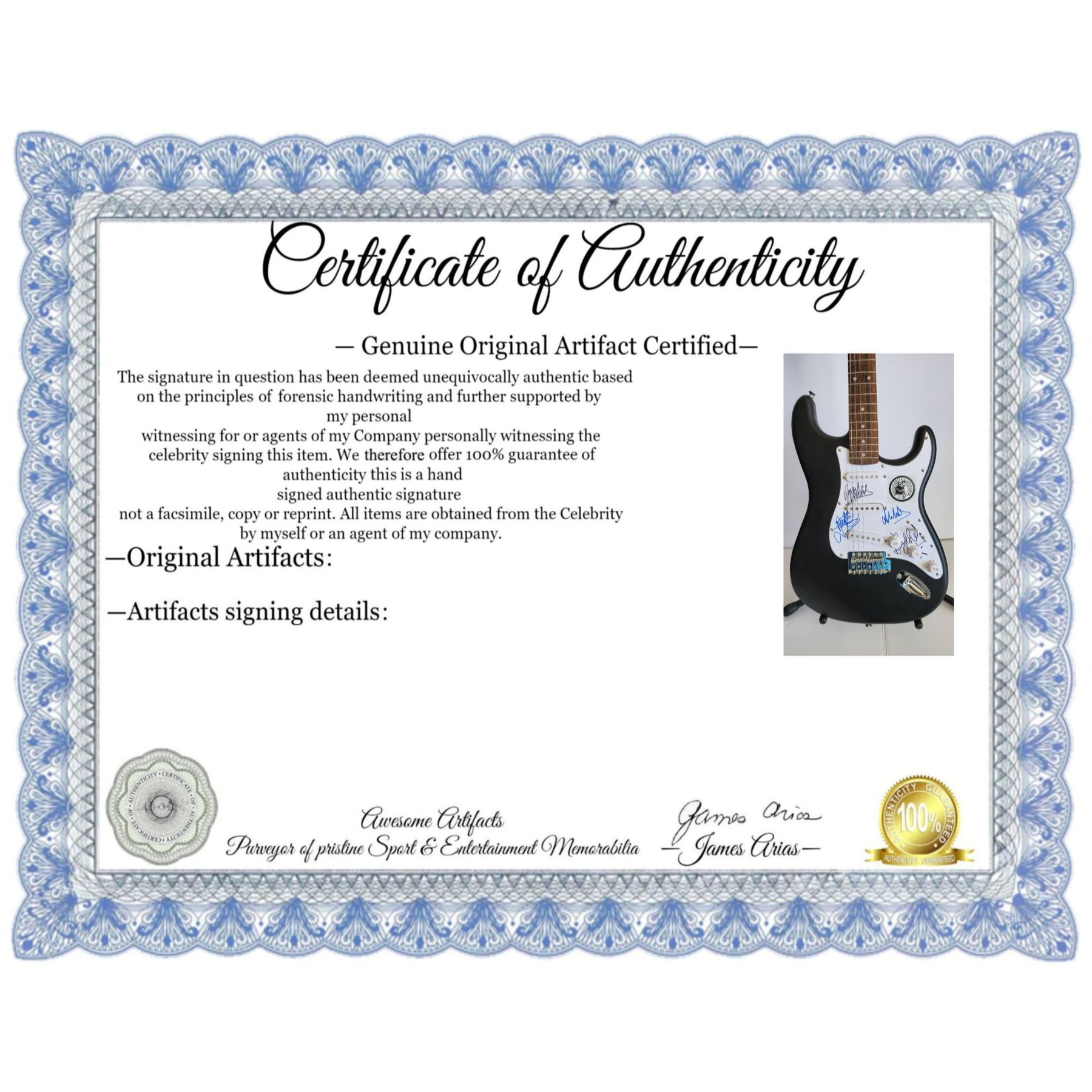 #2 you will receive a certificate of authenticity which will explain the date and location of where I obtained the signatures. Many companies offer an opinion of authenticity I am able to offer 100% guarantee of authenticity as I witness the item being signed personally and I support this claim with signing photos as well as the exact information of where the item was obtained I must say if you take a logical perspective you're getting much more from me than you would get from the so-called authentication companies that give nothing more than an opinion based on no scientific criteria whatsoever by the way