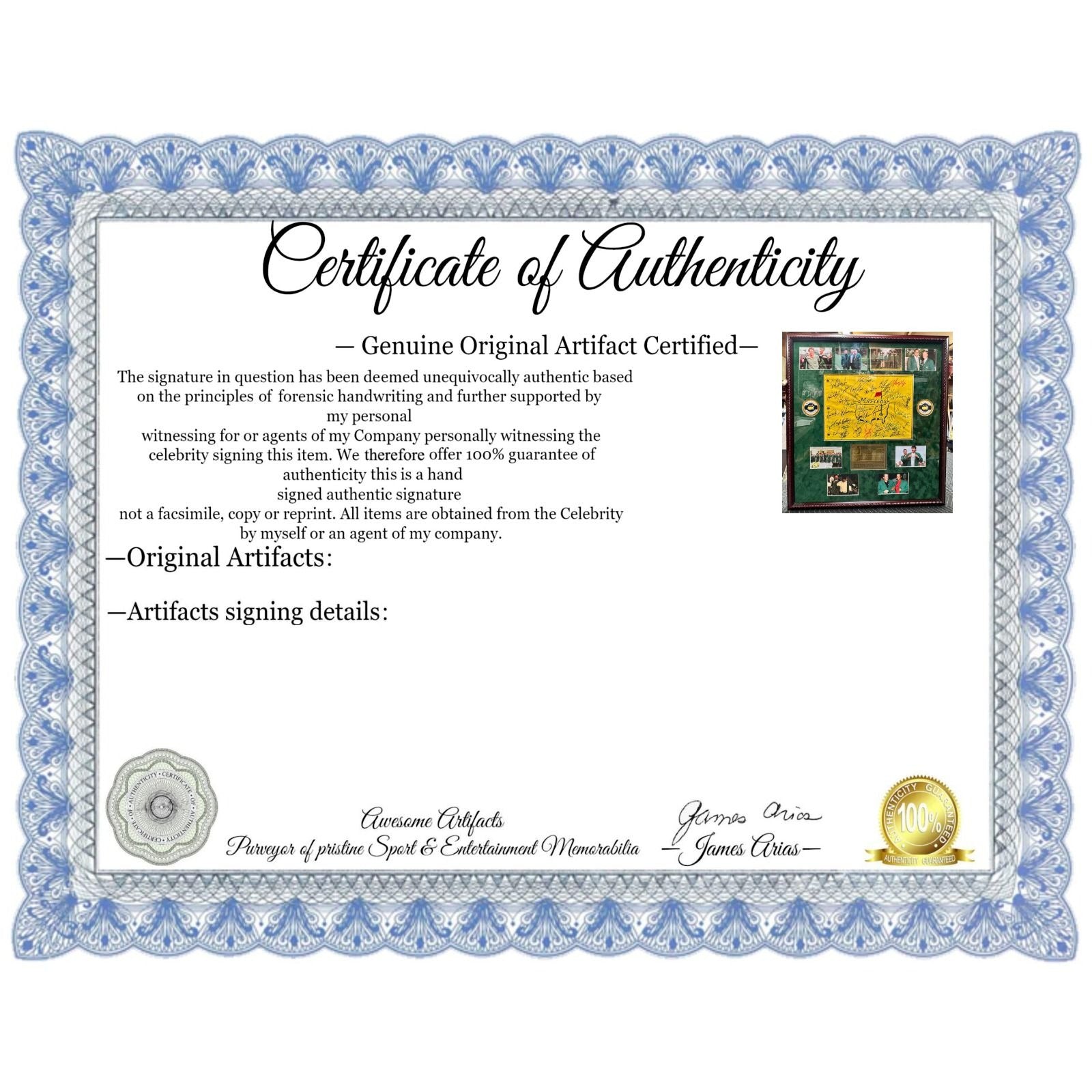 signatures include Mark O'Meara, Adam Scott, Fuzzy Zoeller, Art Wall, Doug Ford, Fred Couples, Tom Watson, Raymond Floyd, Charl Schwartzel, Seve Ballesteros, Bob Goalby, Sergio Garcia, Ian Woosnam, Tiger Woods, Jack Nicklaus, Arnold Palmer, Sandy Lyle, George Archer, Patrick Reed, Jack Burke Jr., Mike Weir, Tommy Aaron, Nick Faldo, Vijay Singh, Bubba Watson, Gary Player, Craig Stadler, Charles Coody, Duffy Waldorf, Dusin Johnson, Hideki Matsuyama, Jordan Spieth, Larry Mize, Billy Casper, Jose Maria Olazabal, Phil Mickelson & Angel Cabrera