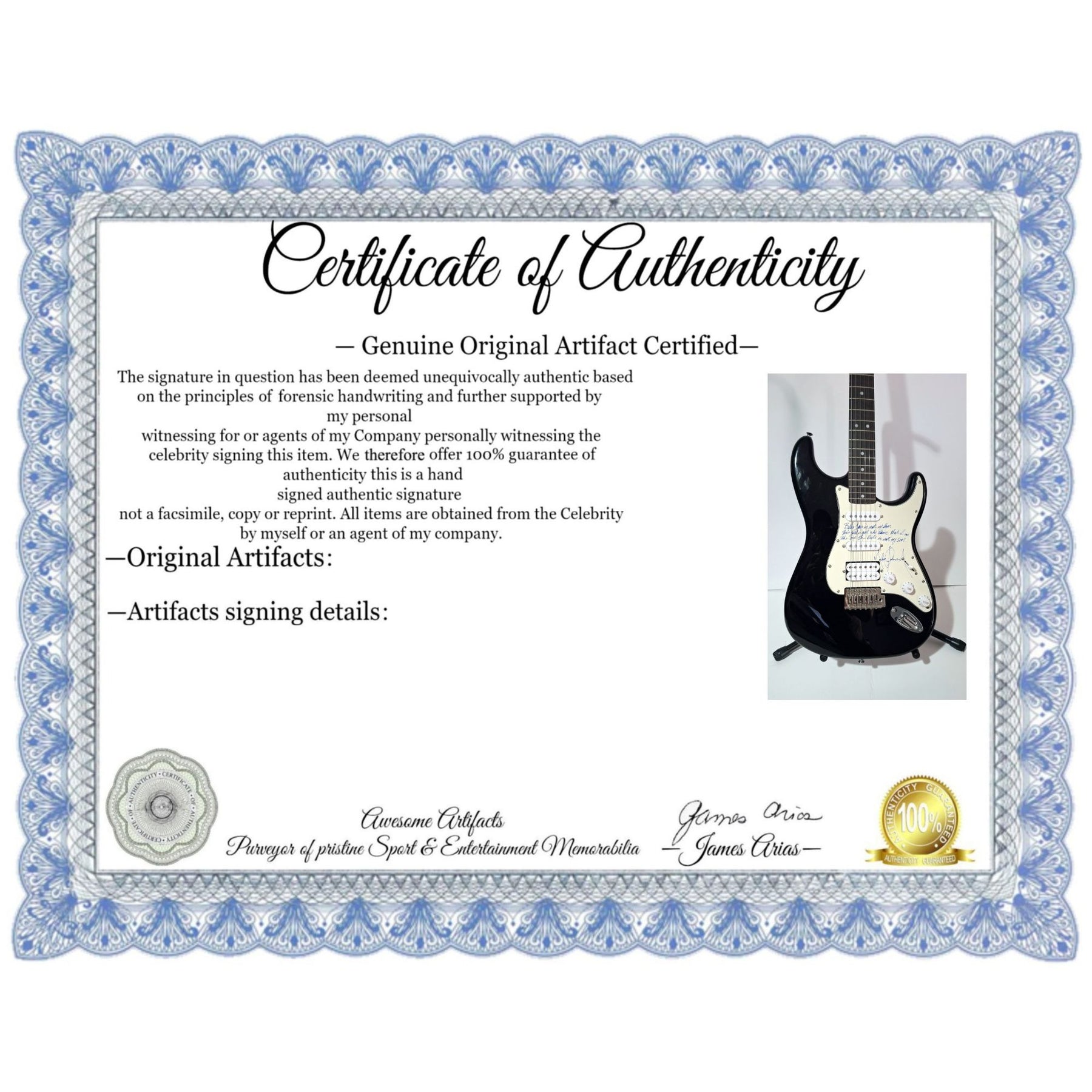 #2 you will receive a certificate of authenticity which will explain the date and location of where I obtained the signatures. Many companies offer an opinion of authenticity I am able to offer 100% guarantee of authenticity as I witness the item being signed personally and I support this claim with signing photos as well as the exact information of where the item was obtained I must say if you take a logical perspective you're getting much more from me than you would get from the so-called authentication companies that give nothing more than an opinion based on no scientific criteria whatsoever by the way