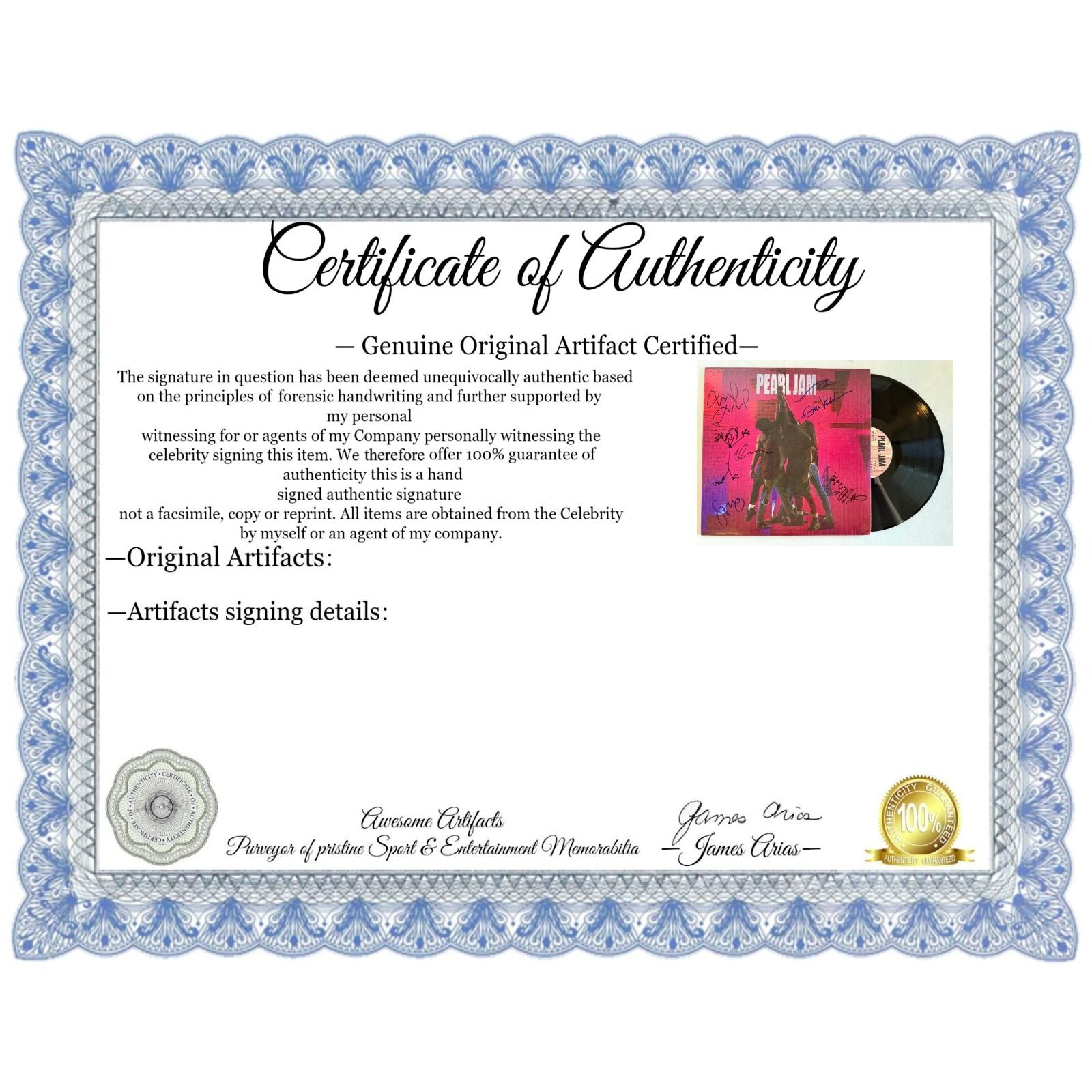Pearl Jam original lp Eddie Vedder, Jeff Ament, Stone Gossard, Mike McCready, Dave Abbruzzese signed with proof