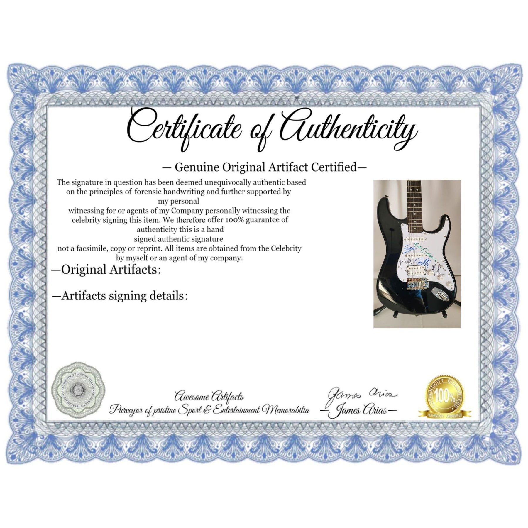 I got this guitar signed by the band proceeding their July 6th 2014 concert date at the Sleep Train Amphitheater in Chula Vista California as they were arriving early July 7th to the Sunset Marquis Hotel in Hollywood California they were performing July 8th at The Forum in Inglewood California and I got the rest of the band to sign the guitar on July 8th, 2014 prior to their concert as they were leaving for the Forum.
