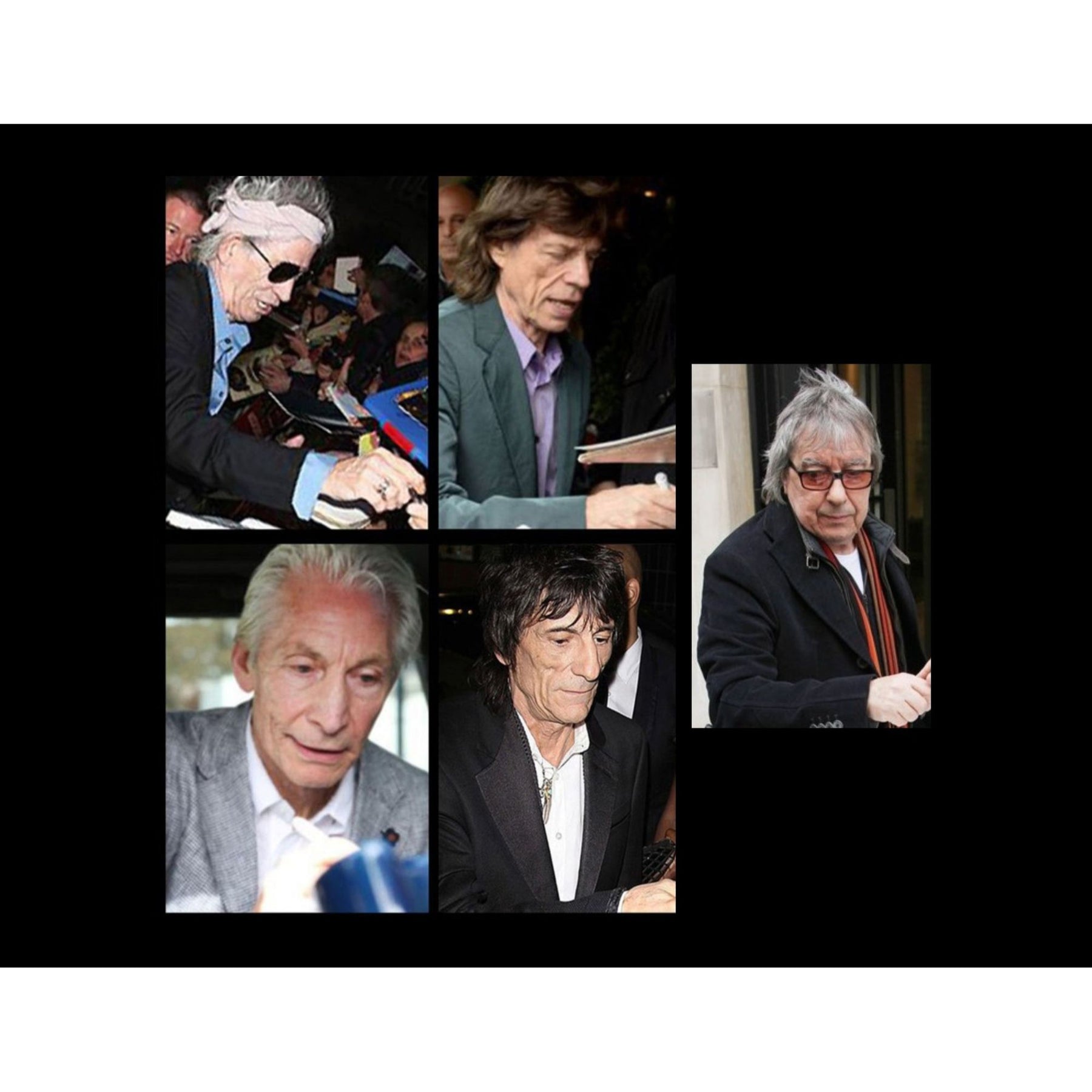 Mick Jagger, Charlie Watts, and Ronnie Wood May 27th, 2015, outside of the Belly-Up nightclub in Solana Beach California where the Rolling Stones were performing at a private show. Bill Wyman signed August 3rd, 2001, at the Trump Marina hotel in Atlantic City, New Jersey where he was performing with his band The Rhythm Kings.