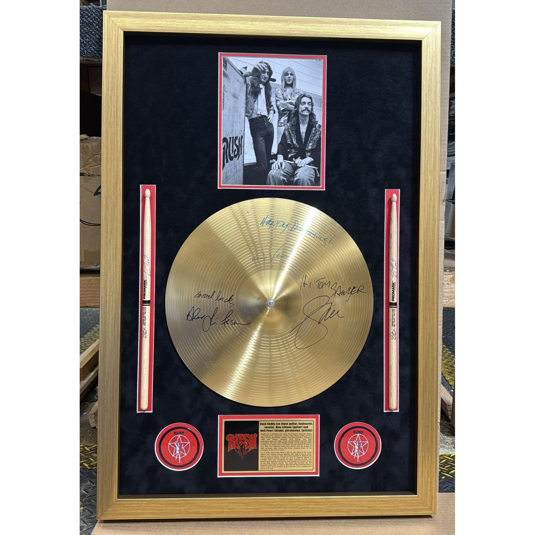 Rush, 12' Cymbal signed, Neil Peart, Geddy Lee, Alex Lifeson with a museum quality frame 25x 37 $2,995