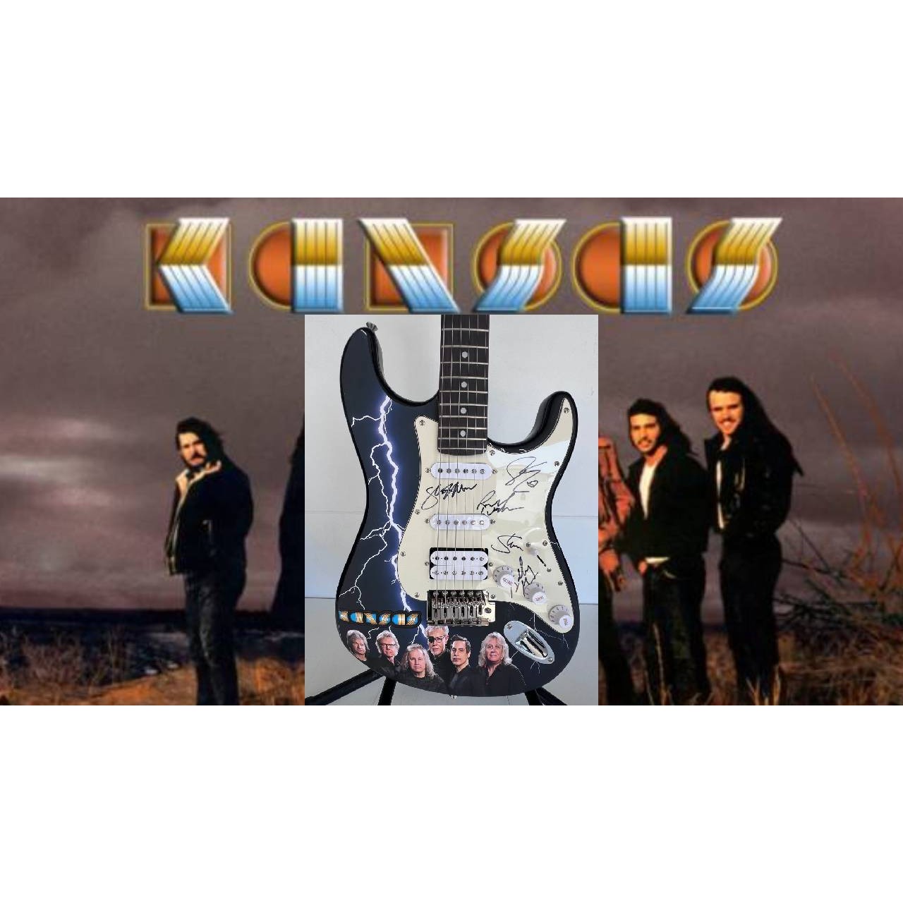 Steve Walsh, Robby Steinhardt, Dave Hope, Kerry Livgren, Rich Williams, Phil Ehart Kansas band signed electric guitar with proof.