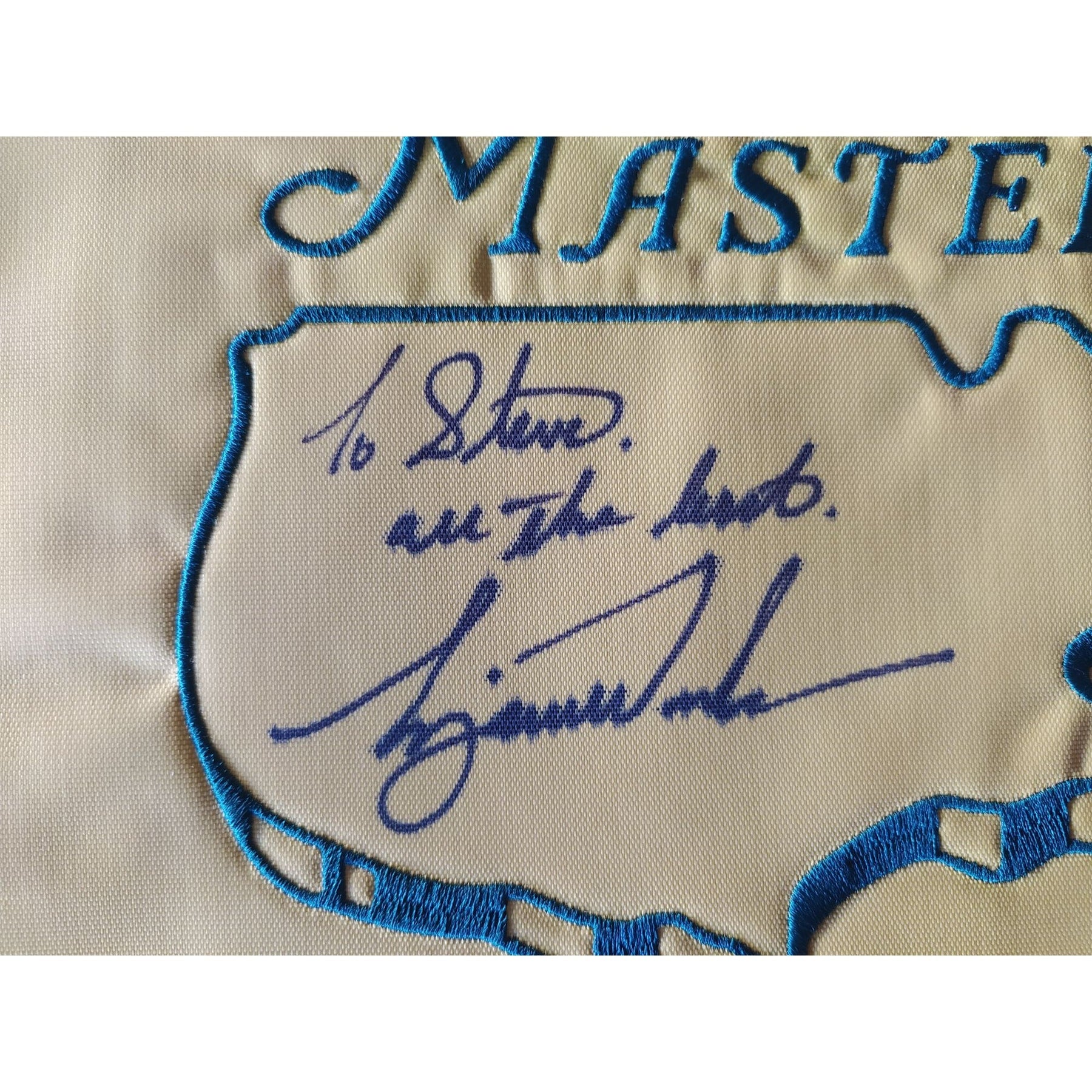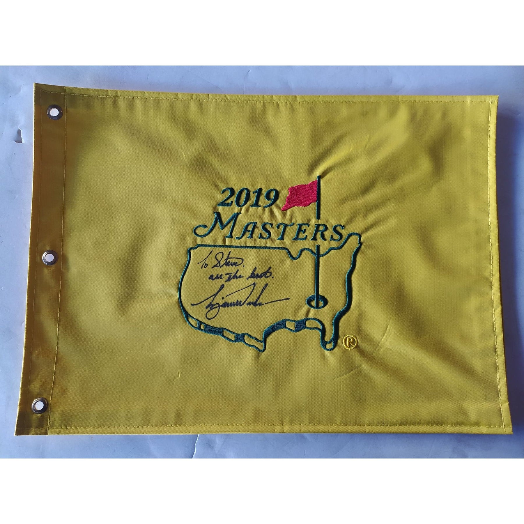 Tiger Woods, 2019, Masters champion, 2019, Masters, pin flag, embroidered, sign with, inscription, to Steve, all the best, Tiger Woods with signing proof $1299