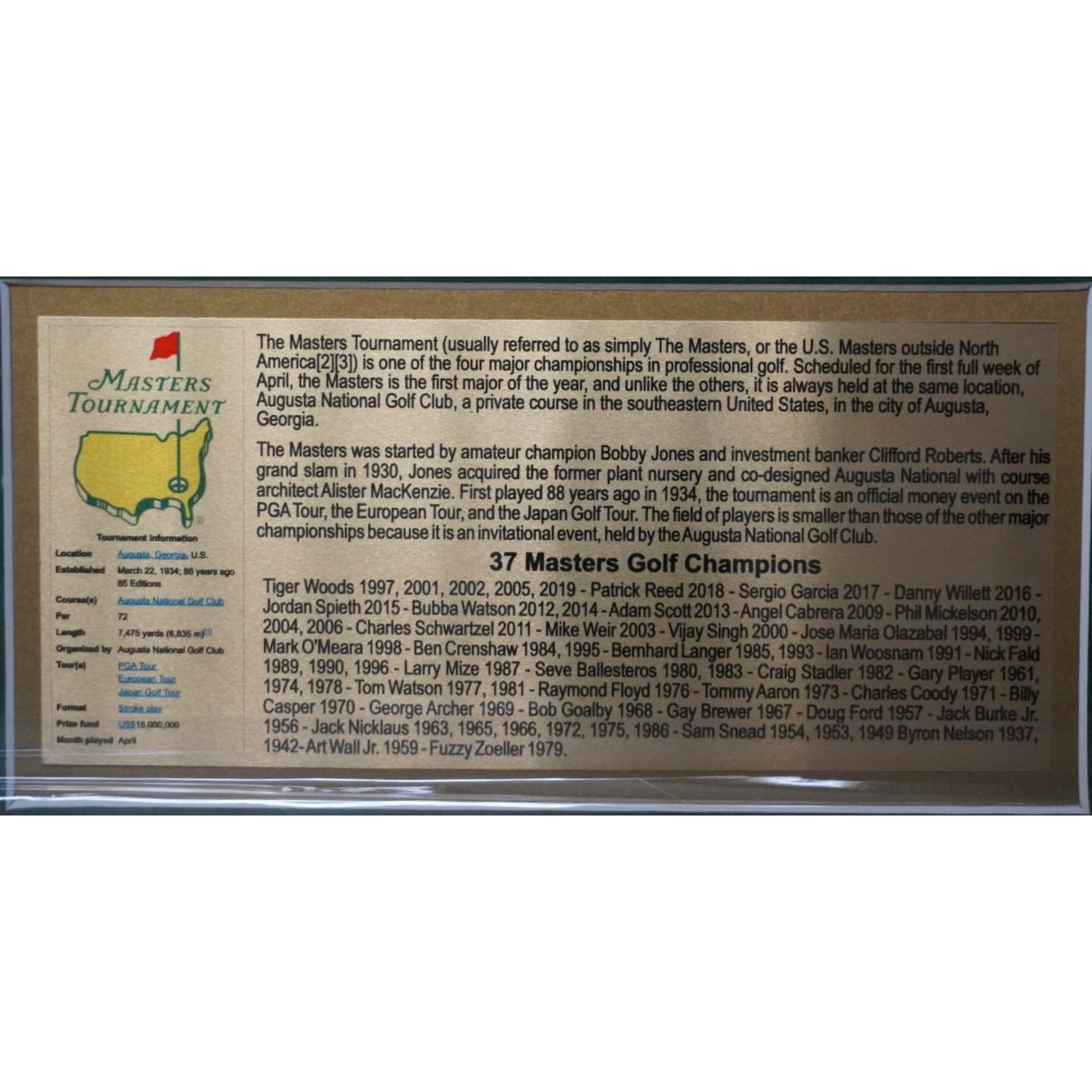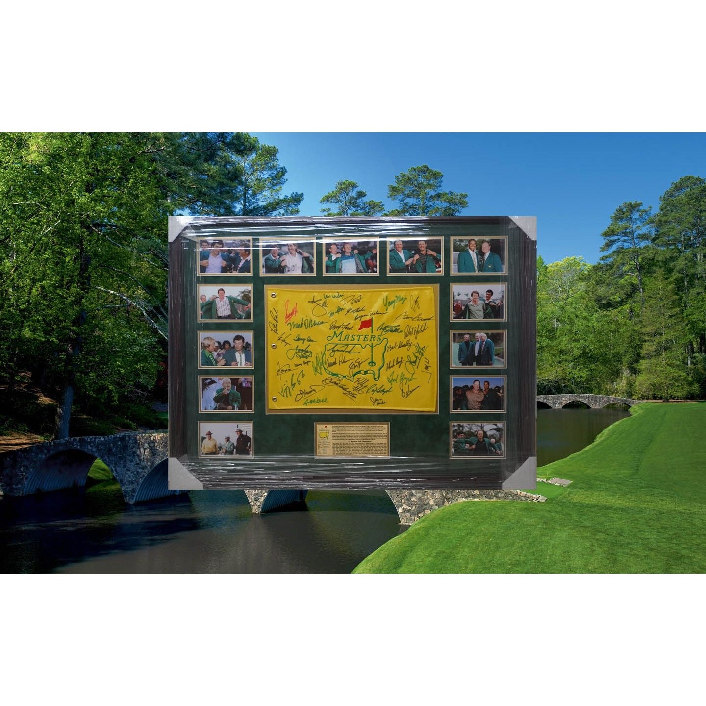 This piece has a museum quality frame a gold plaque listing all of the champions who signed the flag photos of the Masters champions in their Green Jackets. I am only able to include so many photos of the players signing in a listing this is why they are in a collage form but with your purchase I will provide individual photos of the 20-plus Masters champions signing the flag in 4x6 photos.
