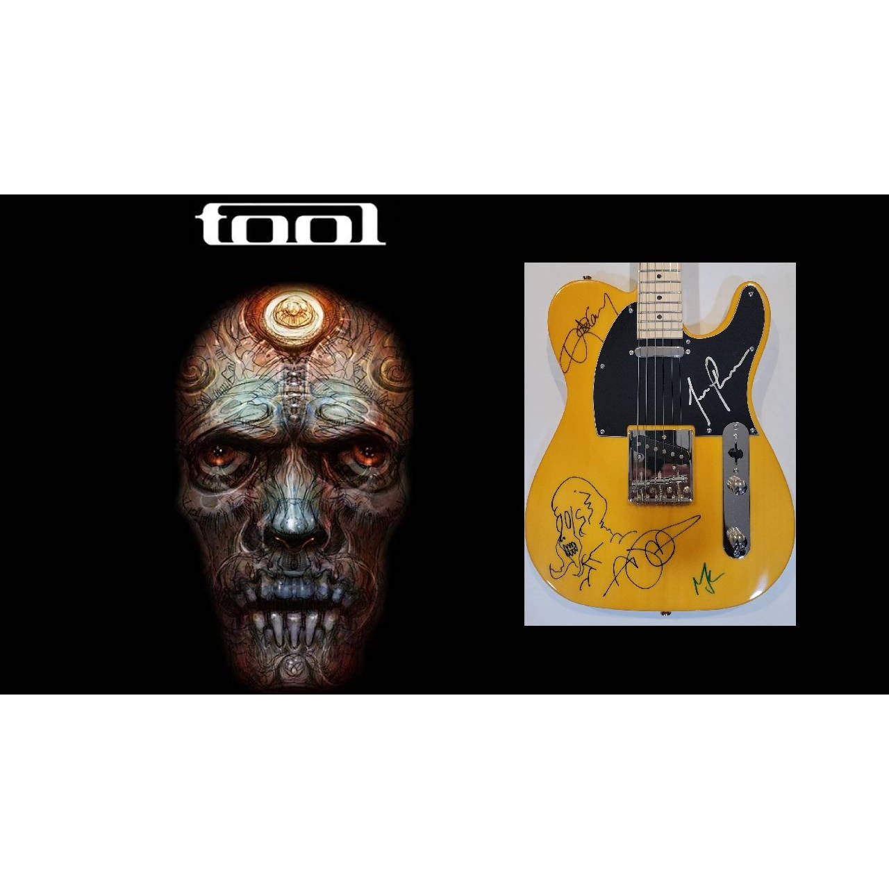 Tool Maynard James Keenan, Adam Jones, Danny Carey, Justin Chancellor signed this Telecaster electric guitar which is in excellent condition: between January 8th through January 10th, 2016, while they were in San Diego performing at the Vias Arena at the Aztec Bowl along with Primus.