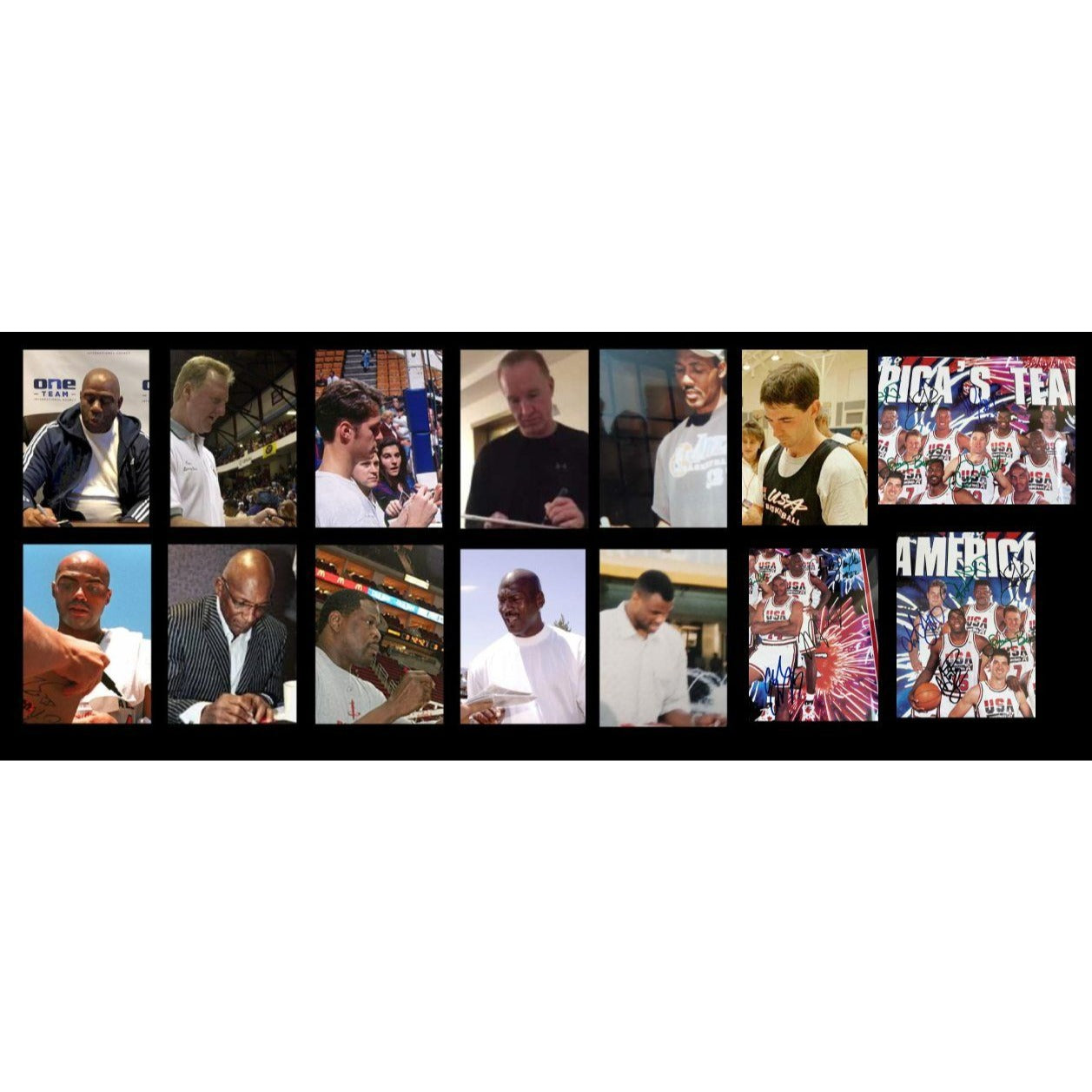 all 13 members of the USA men's 1992 Gold Medal winning team have signed this poster Karl Malone, John Stockton, Michael Jordan, Scottie Pippen, Charles Barkley, David Robinson, Chris Mullin, Clyde Drexler, Earvin "Magic" Johnson, David Robinson, Larry Bird, & Christian Laettner .