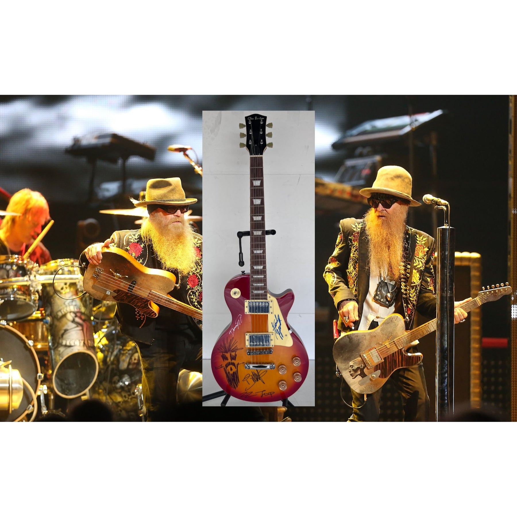 ZZ Top vintage les paul electric guitar Billy Gibbons with sketch Frank Beard Dusty Hill signed with proof.